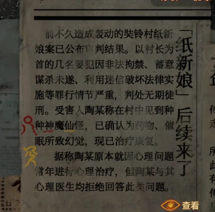 用钥匙打开右边的门,进门后先拿走中间位置的画笔,然后查看一下右边的剪报,这里可以分为四部分,每部分都要查看一下鬼画符和对应的文字,建议直接截图吧,一共是9个字,新闻的内容可以补全一下剧情但是没有其他线索,大体看一下即可。