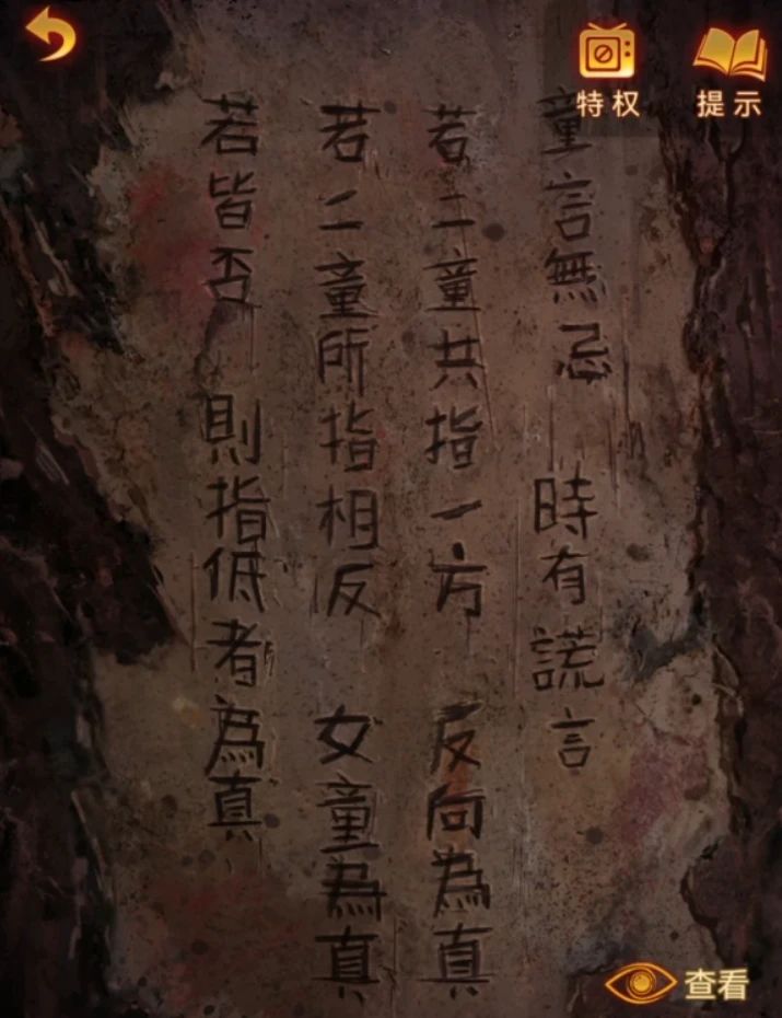 出来来到石碓场景,调查石碓放上种子,然后使用纸灰就能得到一棵大树,把树上的葫芦拿下来,查看一下树干上的线索,总结一下就是两人指的方向相同时候相反的方向是正确的,两人指的方向相对时候女童指的方向是正确的,如果既不相同也不相对那么谁手低谁是正确的。