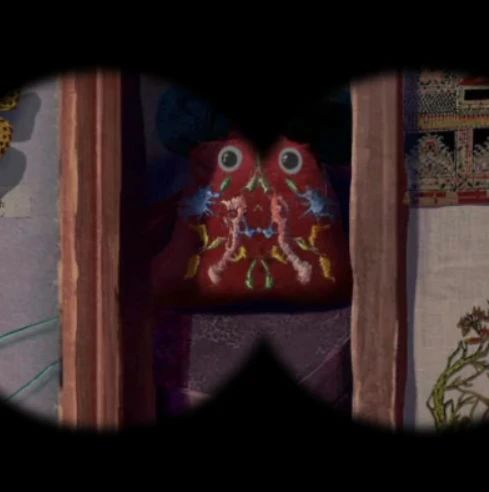 采摘完成后就获得了桃子和龙葵果,这样就可以去调制颜料了,进入里屋后首先是剧情,剧情后对干掉的黑色颜料使用水果,然后用笔蘸取黑色颜料,上树来到海报画眼睛,画好眼睛后查看小小戏台皮影开始前进,但是很快又被河流挡住了,再次下树来到里屋查看桌子上的书,右边的书翻到最后一页桥的位置,拿出红纸后使用剪刀就能剪出一个桥............................这也算桥?????拿着奇奇怪怪的红纸回到皮影戏位置调整大小,让红纸的下面两个.......桥墩?都在河岸两边的石墩上面就能通过了,位置大概如上,注意是要调整桥墩位置不是桥面位置,完成后皮影看了眼镜子就给气晕过去了......感觉,可以理解。