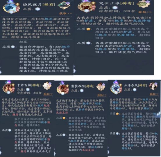 专属技能:如沫春风能够在我方角色出手前能够100%解除所有控制效果并治疗,(实测包括解控狐狸魅惑)一回合至多解控2名角色,整场战斗至多解除6次。这个解控是在被控以后,本队角色出手前解除所有的控制(例如风月如缴械,沉默,魅惑,冰霜,晕眩,冰冻等),此技能用来应付对方九尾狐狸的阵容或者水77等控制较多的阵容。后期值得推荐。