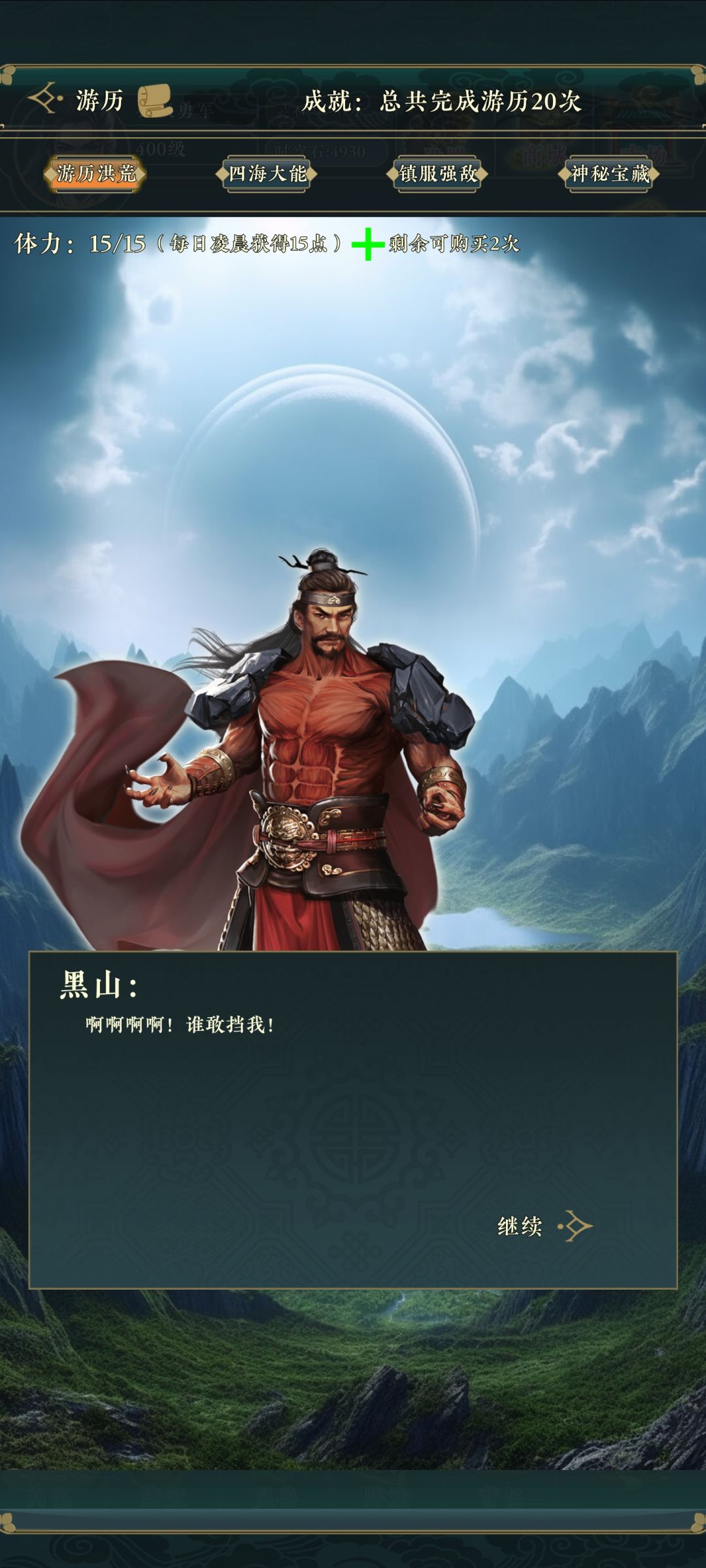 在游历中,每当遇到特定的角色和场景,都会提高相应对象的游历完成度,当完成度满时,将会获得相应的完结奖励,包含法宝、弟子、种子等等珍稀宝物。
