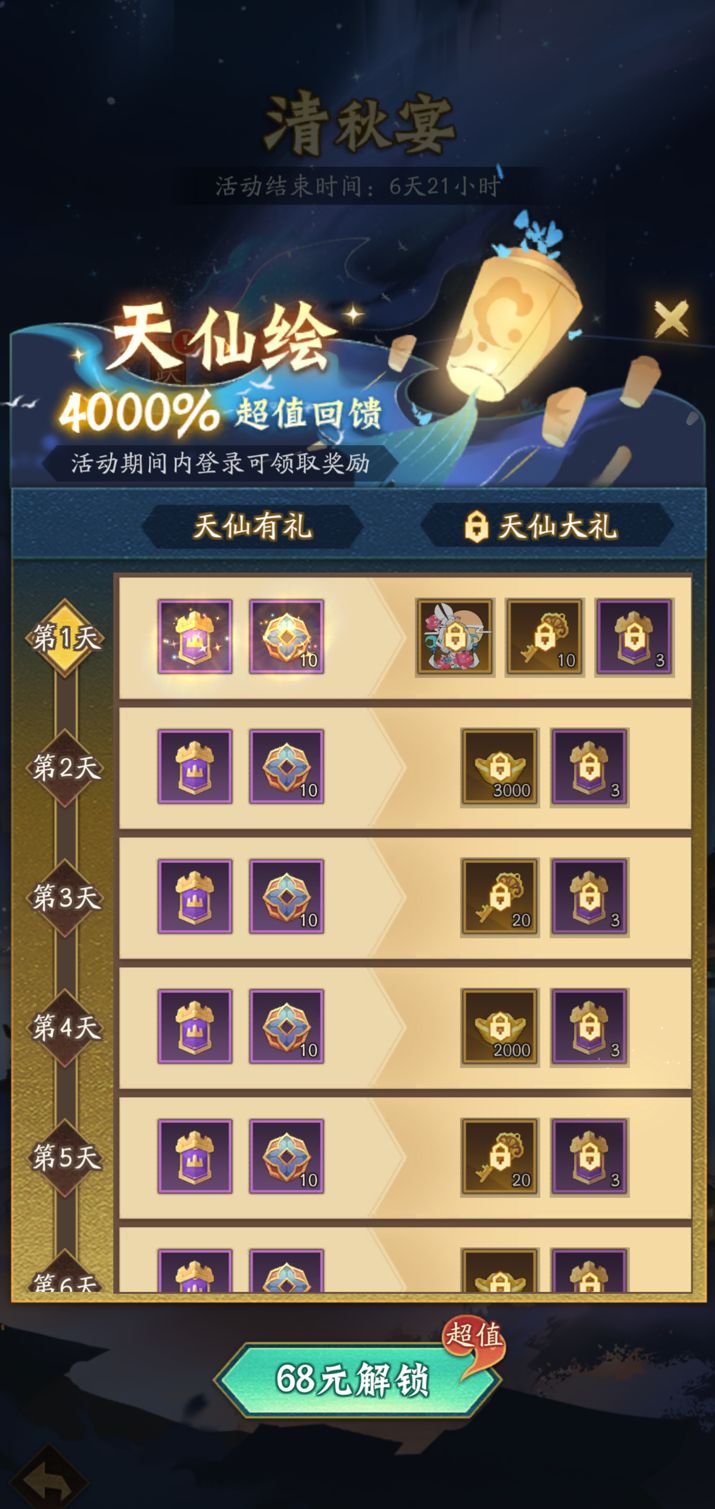 活动期间,道友登录游戏即可在天仙绘中领取清秋币、踏山令牌,还可以付费解锁更多花好月圆表情、踏山令牌、百宝阁宝箱钥匙、元宝等奖励哦~