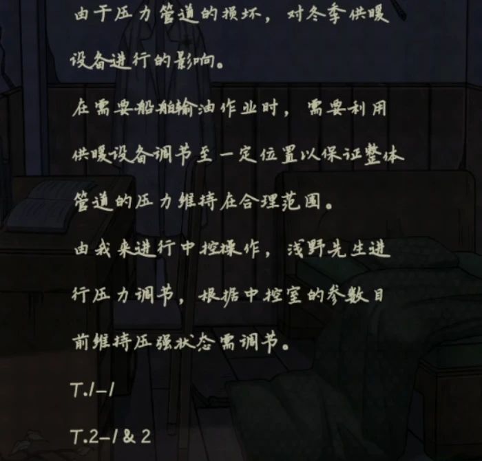 进入中控室看过剧情后点击中间有键盘的仪器使用钥匙,但是点击开始输油后提示压力不对,点击右边的仪器使用IC卡后就能给卡片解锁权限了,然后跳回右边上楼,用IC卡能打开右边房间的门了,开门后在桌子上发现一本笔记本,看这三个形状就知道该出门看一眼时间了。