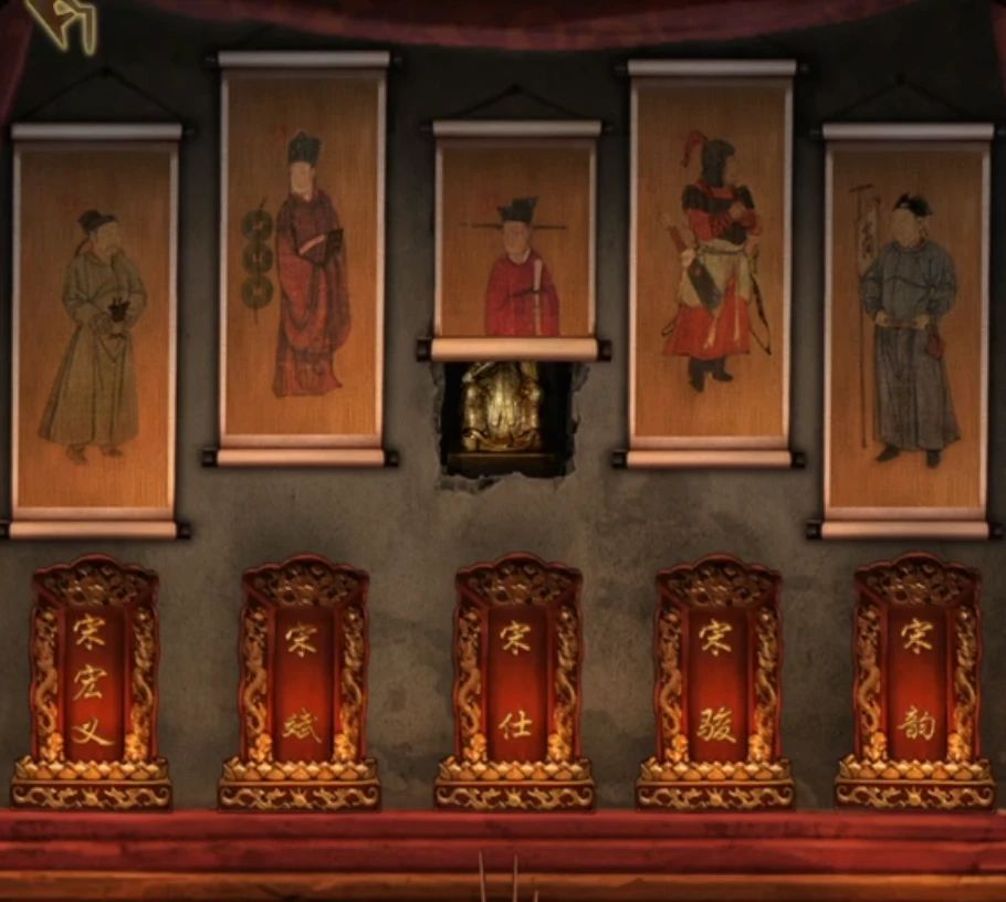 查看一下中间的供桌将牌位调整到和后面画像一致,点击画像可以放大,放大能看到的细节就是最右边的画像后面写了个商字,最左边抱了个酒杯,实在忍不住再吐槽一句,祭酒和酒杯有什么关系???按这个逻辑是书记必须抱着本书?小说家要不停的说话??咳咳又扯远了,总之最左边抱着酒杯的就是祭酒宋宏义了,第二个旁边有一串钱而且穿着官服是户部尚书宋斌,中间没线索排除法,第四个腰间有刀是武将骠骑将军宋骏,第五个后面写着商是行商宋韵,那么中间就是剩下的尚书了,所以排列一下如下。