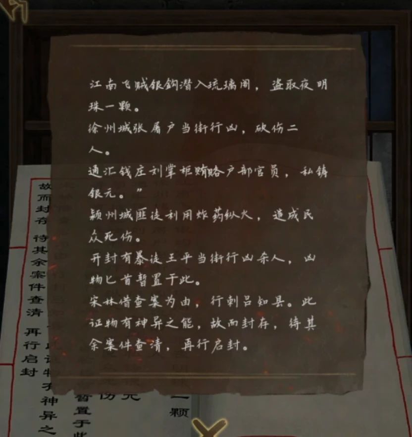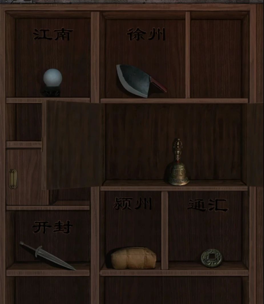 这里的线索直接点击查看吧,总结一下重点江南是盗窃夜明珠,徐州是屠户砍人用的是菜刀,通汇是银元,颍州是炸药,开封是匕首伤人,根据这个调整一下右边证物柜的物品和对应地名,完成后中间柜子打开拿到引魂铃。