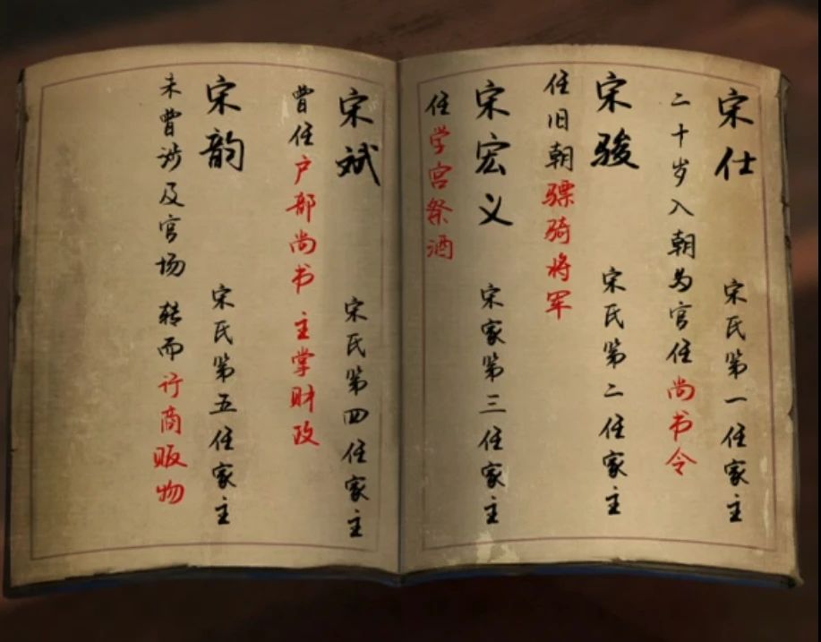 回到庭院把莲花灯放进水池,还少最后一盏了,正门封条使用匕首进入,原来这里是祠堂啊,左边桌子上查看线索,宋仕尚书令,宋骏骠骑将军,宋宏义学宫祭酒,宋斌户部尚书掌财,宋韵行商。