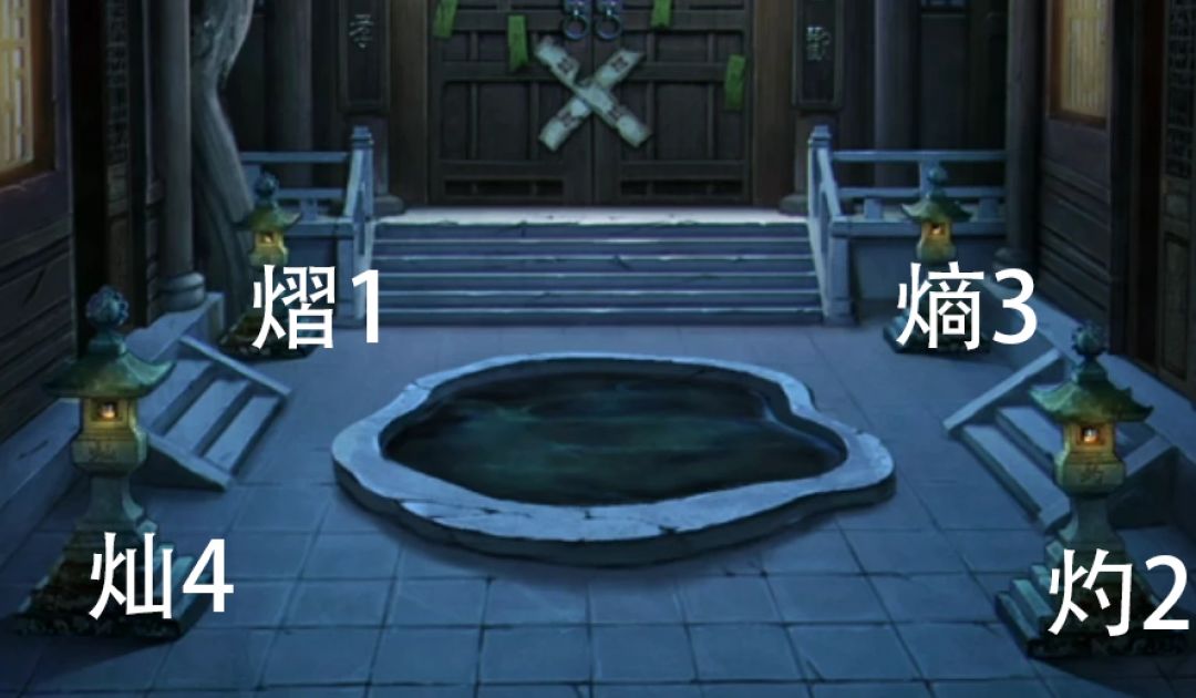 出门后按照纸条的顺序使用火折子点燃四角的石灯,点燃后中间的池塘就自动注水了,可以顺手把魂灯放进去也可以一会一起,进入右边的书房调查。