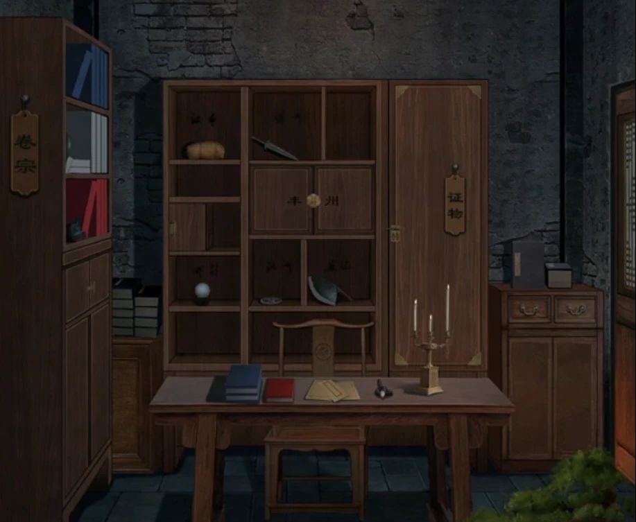 调整完毕后回到证物室,这时候桌子上的三根蜡烛也烧好了,不知道为什么燃烧速度不同,根据蜡烛底座上的字从高到矮是刑盗命,对应颜色的话就是白蓝红了,然后注意一下整体场景,点到桌子就看不清楚书了哦,书架上的书都是5分,桌子上还有额外的2本蓝色1本红色,那么书的数量就是白5蓝7红6了,所以调整一下左边书柜的密码到576就能打开柜子下面看到线索了。