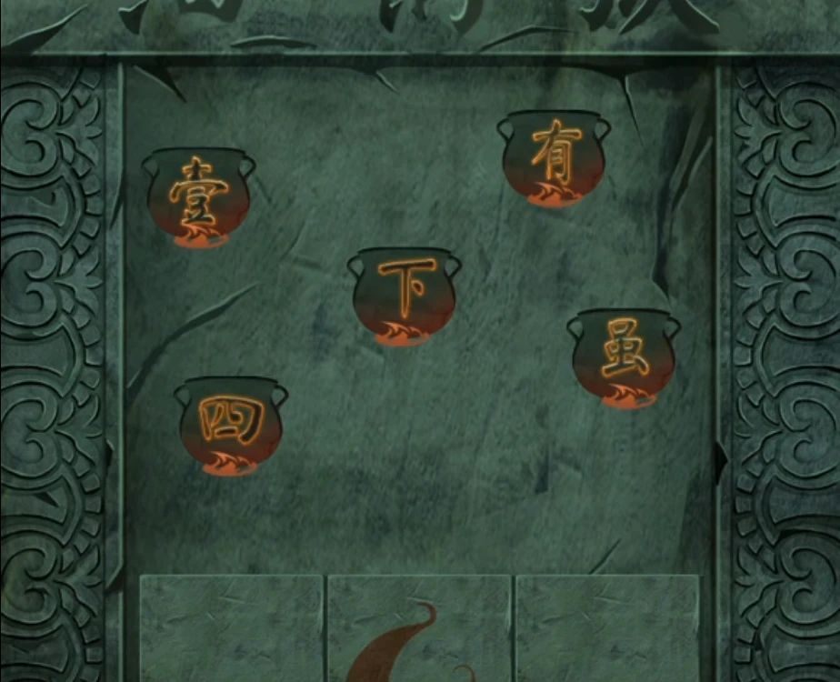 右边的石碑查看一下记住舌头长度和眼睛的关系,一格舌头是没有眼睛,两格舌头是左眼,三格舌头是右眼,四格舌头是双眼,舌头上的图案也记下来,将前面的四个抱锅小鬼按照眼睛的状态调整舌头长度和油锅里的图案,调整完毕后两盏鬼火都亮起大门打开。