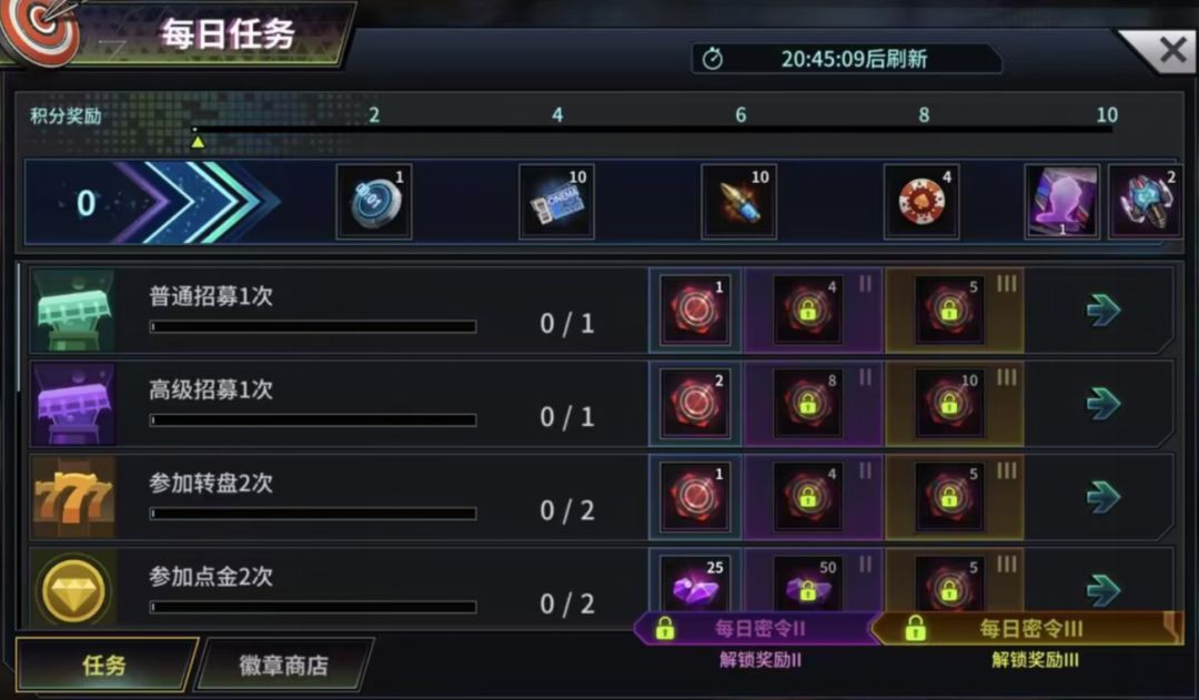 各位探长可通过在边城警视厅完成不同颜色次数任务来领取档位奖励。子弹可用于刷新任务,警徽可用于重置任务。不同任务对英雄的阵营,品级和星级均有不同要求。任务可进行锁定,被锁定的任务不能手动刷新,但每隔24小时会自动刷新。