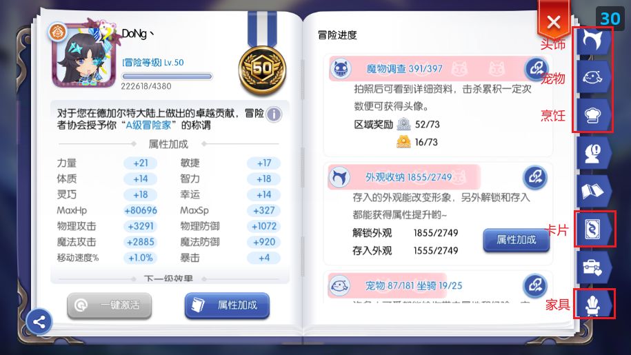 关于冒险录存入方面的话有挺多,这里主要拿比较常见用于提升存入的几个类型进行分享,包括饰品相关、宠物相关、料理相关、卡片相关、家具相关,其他冒险者等级和成就等就看大家的喜好去探索提升就好。