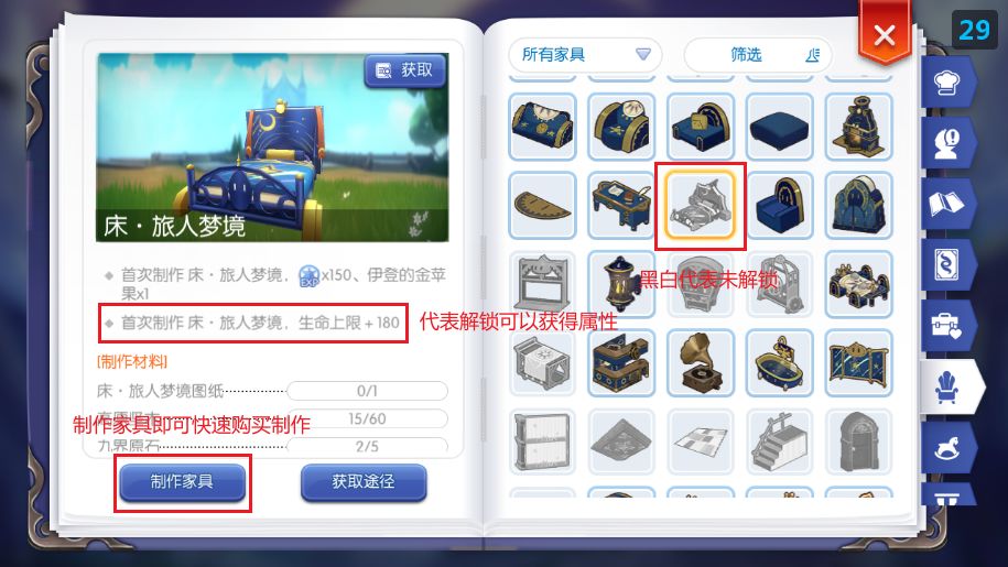 现在制作家具比以前方便了,以前的家具材料是每周限定个数的,想做的快都不行,现在没限定后只要制作即可解锁。