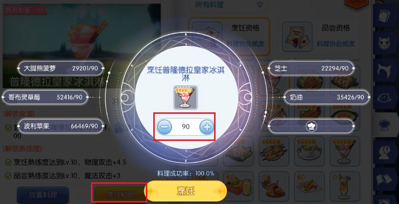 ②品尝解锁:品尝到90件即可解锁该料理的属性。