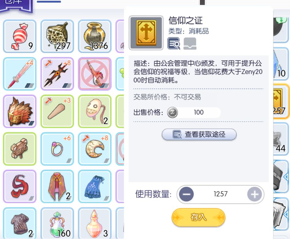 一般需要每个物品捐献2次,紫色材料不捐,会获得2个信仰之证1个对应一个材料,第三次继续捐都可以,但是不太划算。信仰之证可以放通用仓库,然后给大号使用。