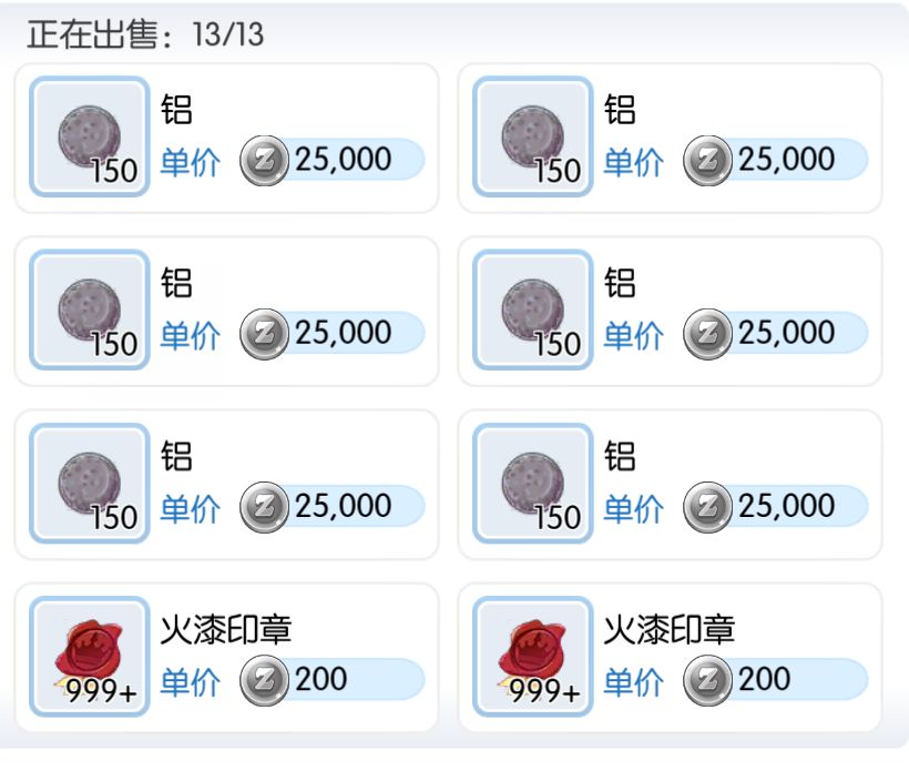 当你一个角色不够卖东西的时候,就是你有好多好多材料,好多铝的时候,就可以用三个角色(背号需要也是铁匠,现在有免费券可以直接开铁匠给背号)同时卖了,这样的速度很快,但是也很靠自己的耐力,所以上架有个有技巧。