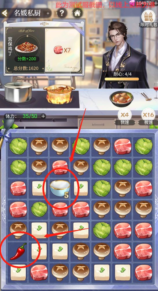 试菜员耐心值为0时棋盘内有可消除(辣椒)和不可消除(瓷碗)两种障碍将辣椒上下左右的棋子任意消除一个即可将辣椒一同消除小Tip:瓷碗无法被消除,5个回合后自动消失