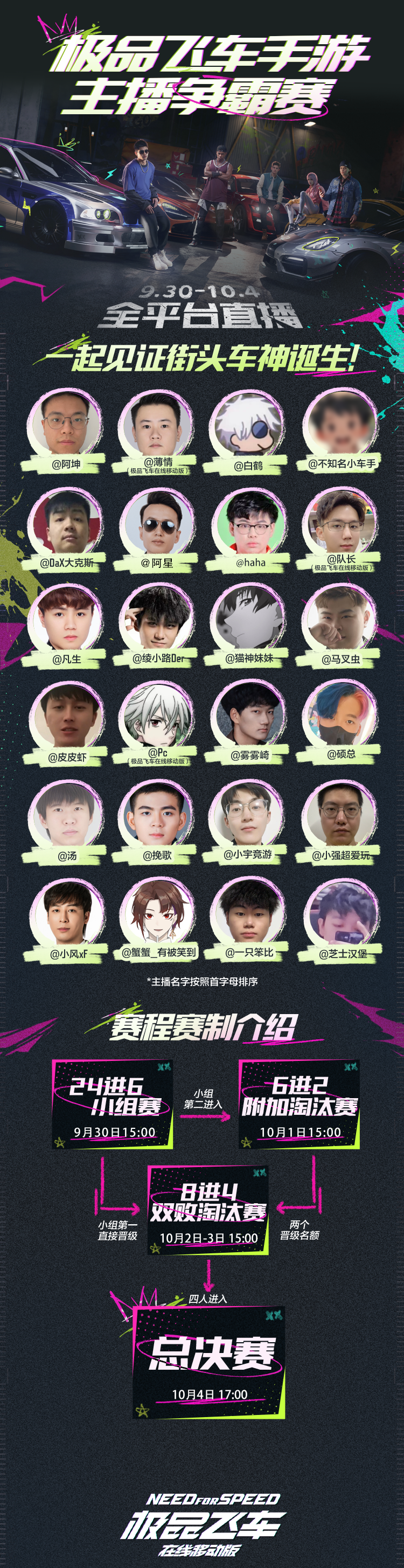 极品飞车手游主播争霸赛淘汰赛(8进6):10月2日15:00-22:00,8人通过抽签两两对决+复活赛晋级;