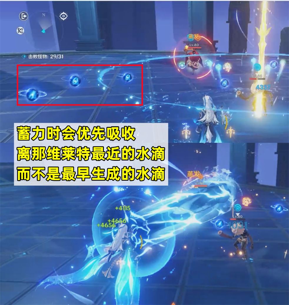 那维莱特进行蓄力重击时,吸收3枚源水之滴就可以瞬间完成蓄力。而吸收的选取逻辑是,选择面前离那维莱特最近的水滴,并不是最早产生的水滴。这点还会影响到输出手法,如果一开始就用大招和战技,有可能会导致离得比较远的源水之滴持续时间到了却没被吸收。所以除非是六命的那维莱特,一般都是技能和蓄力重击穿插使用会更好。