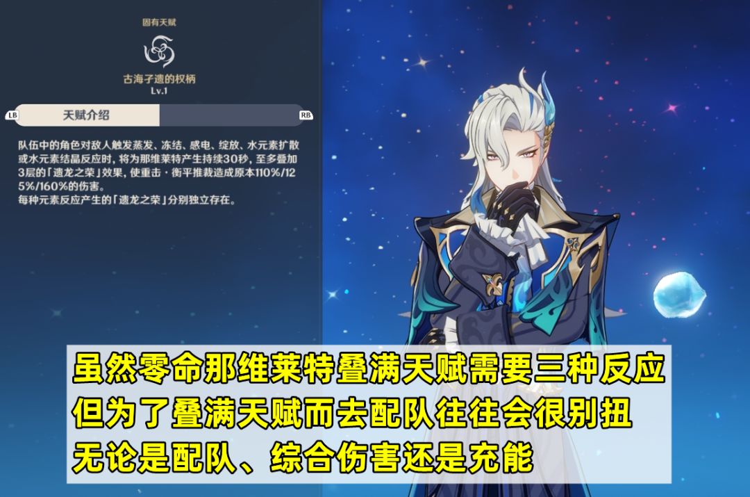 关于配队选择:如果是零命的那维莱特,想要叠满天赋的增伤需要三种反应,也就是需要四色队。但是除了超绽放外,如果为了叠满天赋凑四色队往往会很别扭,所以个人一般更推荐选择三色队,比如那维莱特+莫娜+万叶+钟离(或者白术)的组合。