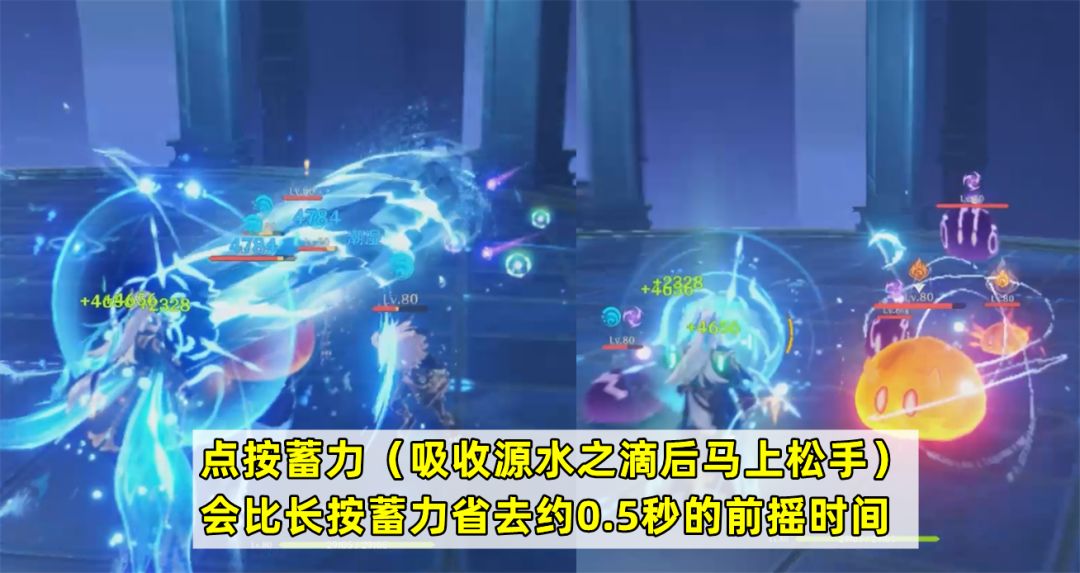 秒蓄力的技巧:上面提到吸收3枚源水之滴就可以瞬间完成蓄力,事实上还有个小技巧能让蓄力更快。就是在吸收水滴后,马上松开普攻键,就可以比按住普攻键更快释放蓄力攻击。因为长按有明显的前摇,大概0.5秒左右,点按的话可以省略掉大部分的前摇时间,原理跟弓箭手的取消后摇技巧类似,但是操作上更简单。