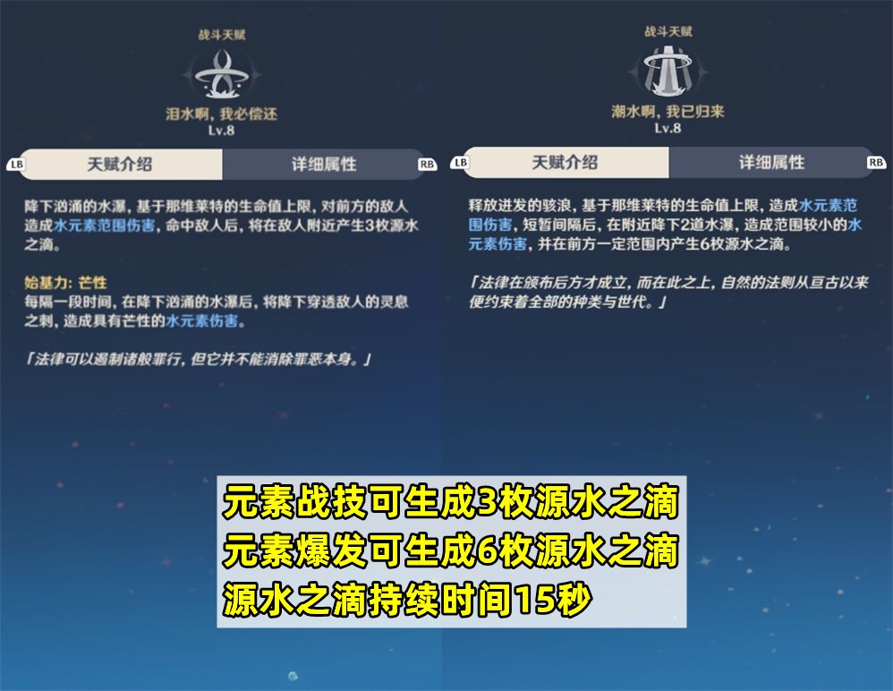 源水之滴的吸收逻辑:众所周知,除了四命以外,那维莱特产生源水之滴的途径只有两个。大招可以产生6枚源水之滴,战技则可以产生3枚,而每枚源水之滴的持续时间为15秒。