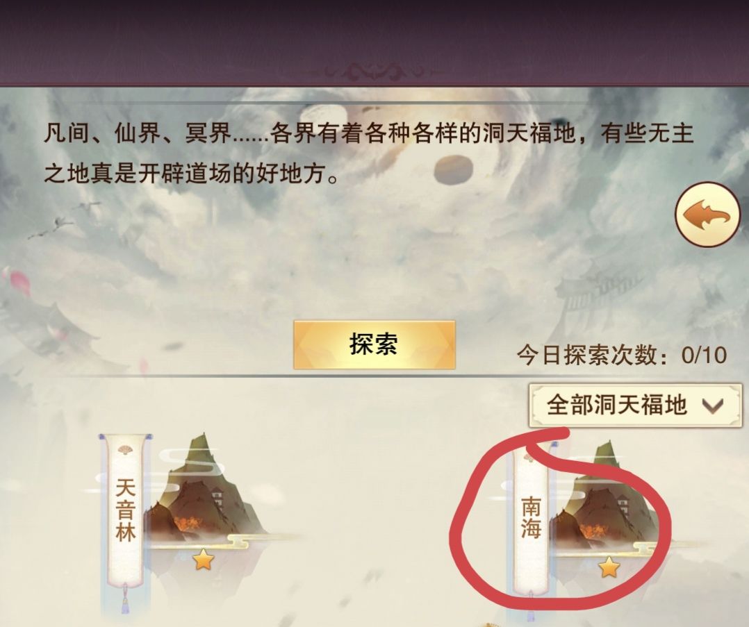洞天福地:每天探索十次(差不多两三天一个洞天福地),探索到洞天福地第二个南海(如图)