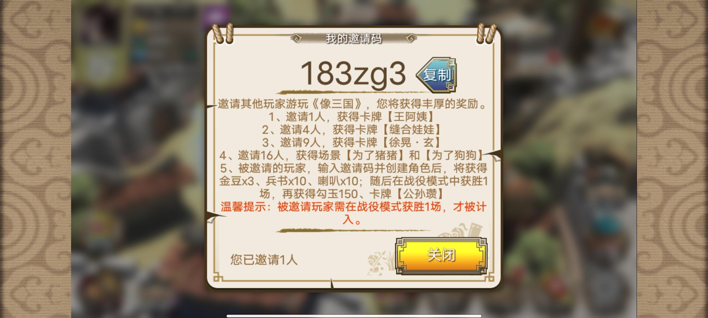 1、注册游戏一定要填写邀请码,只有一次填写机会,可以领150勾玉(重要)+公孙瓒;