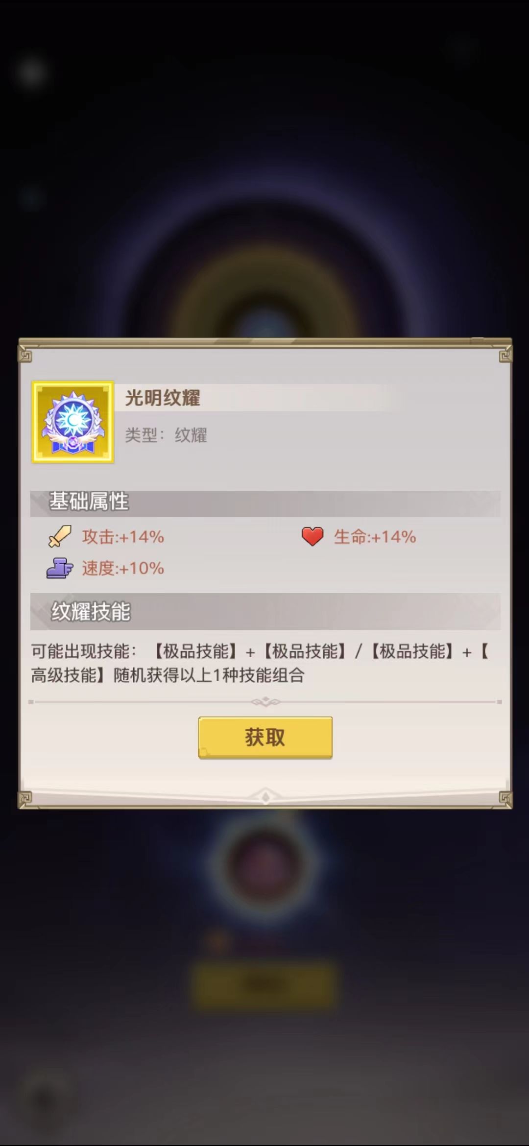 目前我知道的国服终极纹耀是金色的光明纹耀,攻击和生命加14%,速度加10%。最高可出现极品技能+极品技能,如下图