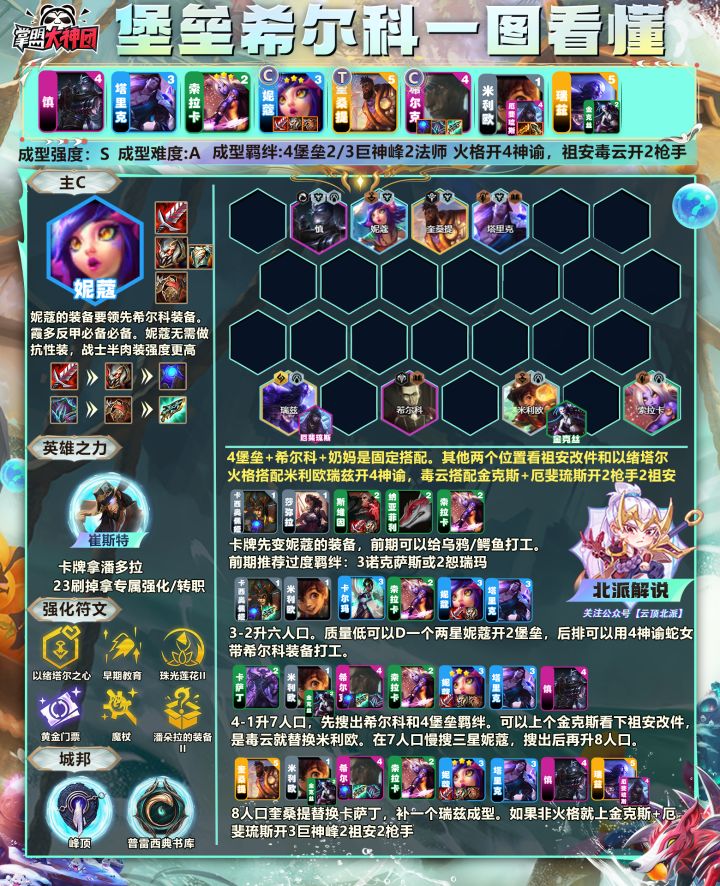 阵容理解:主C希尔科有两种最强提升,一个是后排火格,另一个是祖安毒云。这套阵容4堡垒+希尔科+奶妈6个人口是固定搭配,其余2个人口如果是火格可以上米利欧+瑞兹开4神谕,如果是毒云可以上金克斯+厄斐琉斯开2枪手2祖安3巨神峰,然后养一个厄斐琉斯的副C。