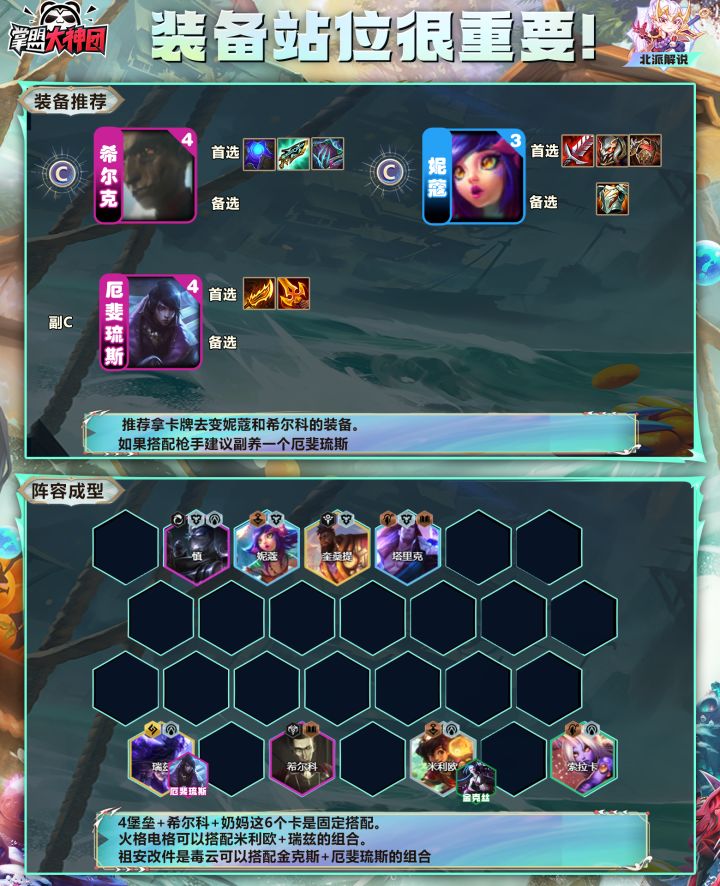 装备思路:妮蔻装备优先级很高,北派不推荐大家做纯肉妮蔻,饮血+泰坦的半坦战士流强度更高,而且可以摇摆剑姬。这个版本因为霞多,所以第三件一定补反甲。可以之后再做希尔科的装备,这样转剑姬时卡莎不会烂装备。