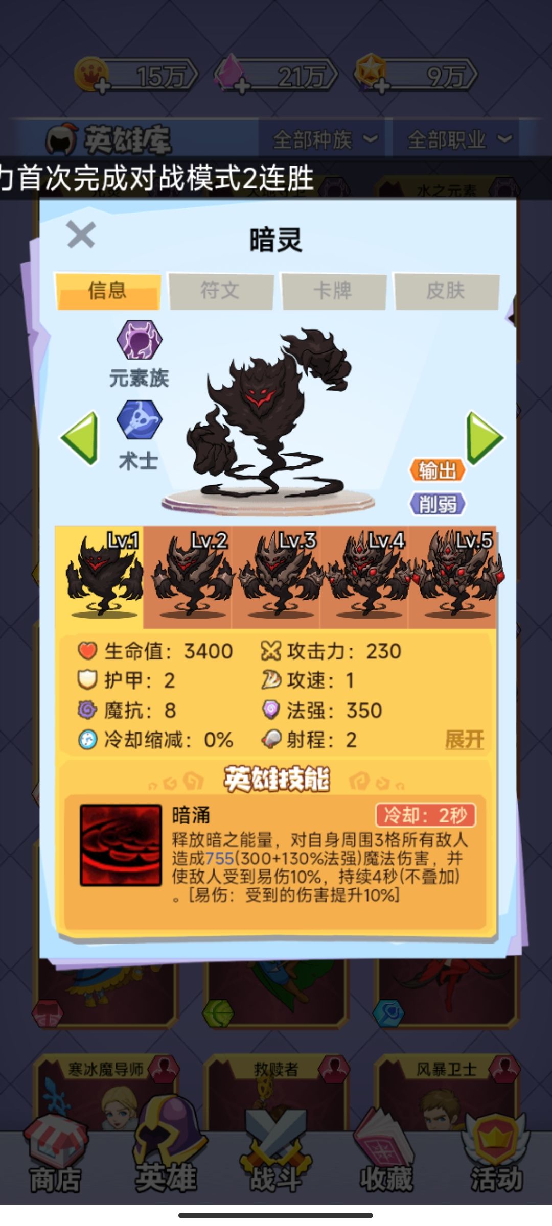 暗灵是对战模式中最强的英雄极快的技能冷却速度加大范围AOE在加上符文的技能伤害提升能快速蒸发对面新人如果要玩对战模式一定优先买暗灵再买其他几个剩下的几个英雄分辨是