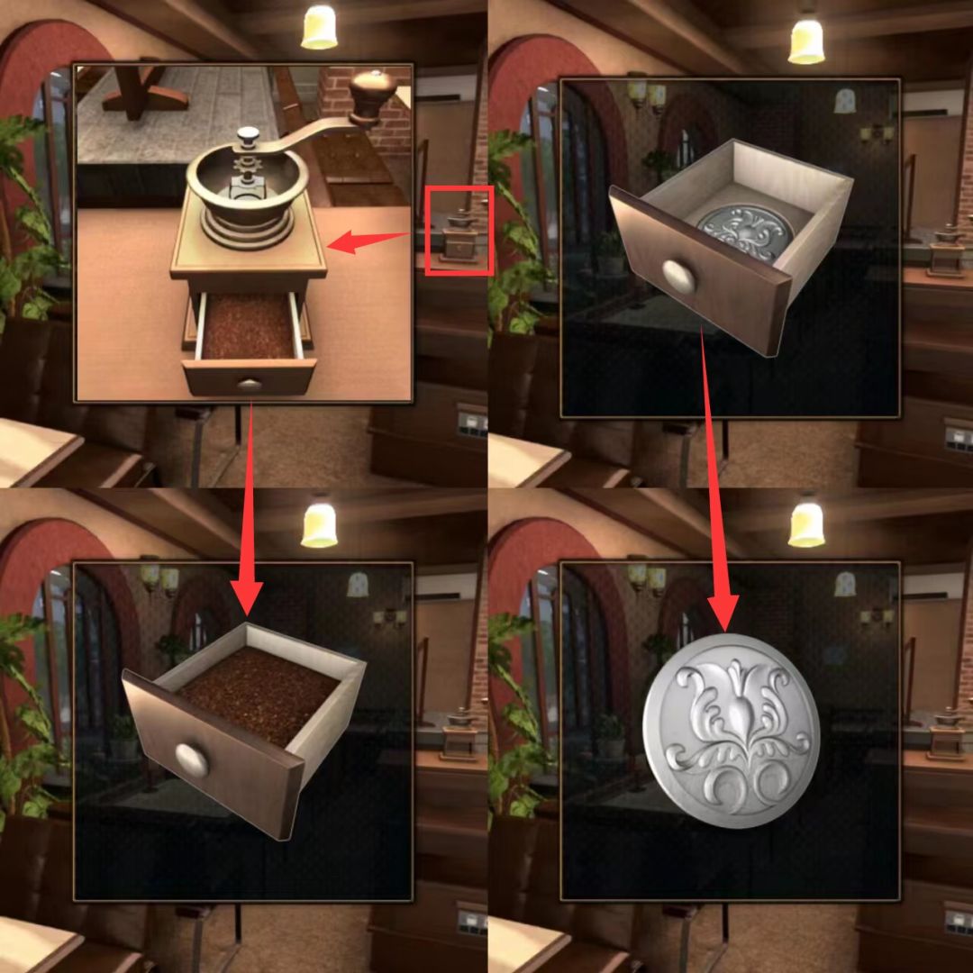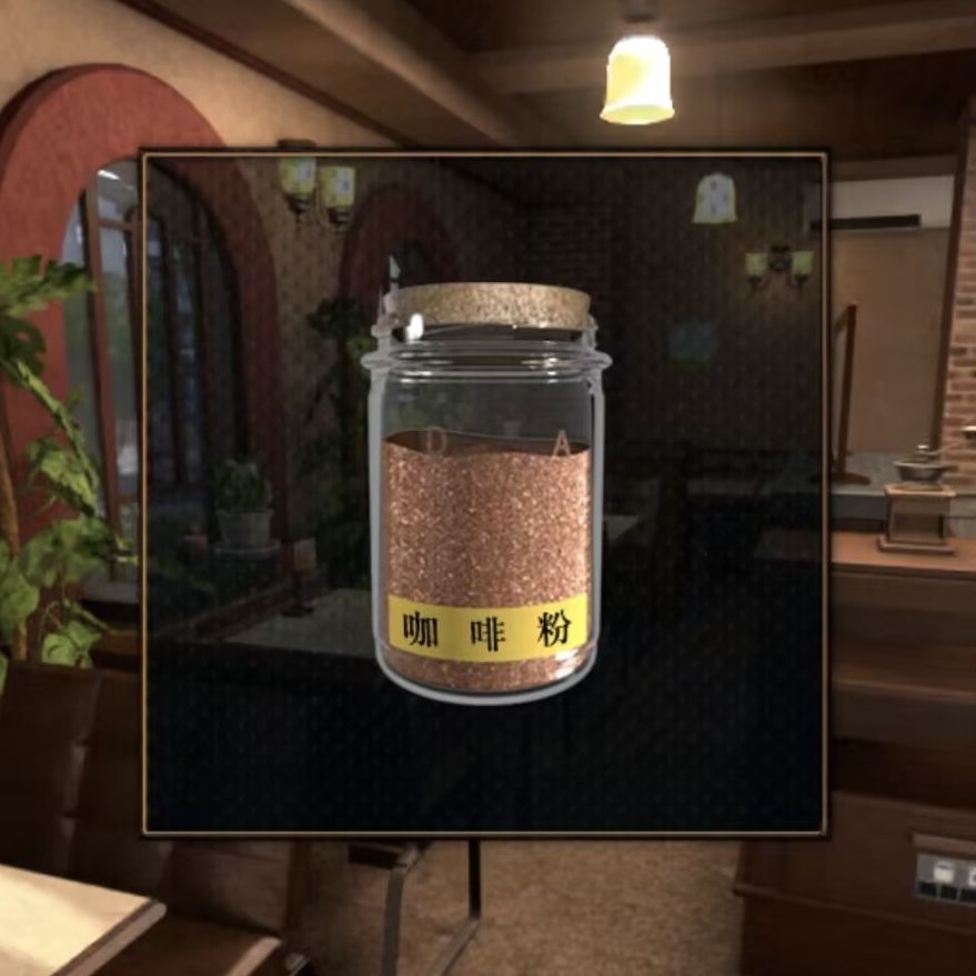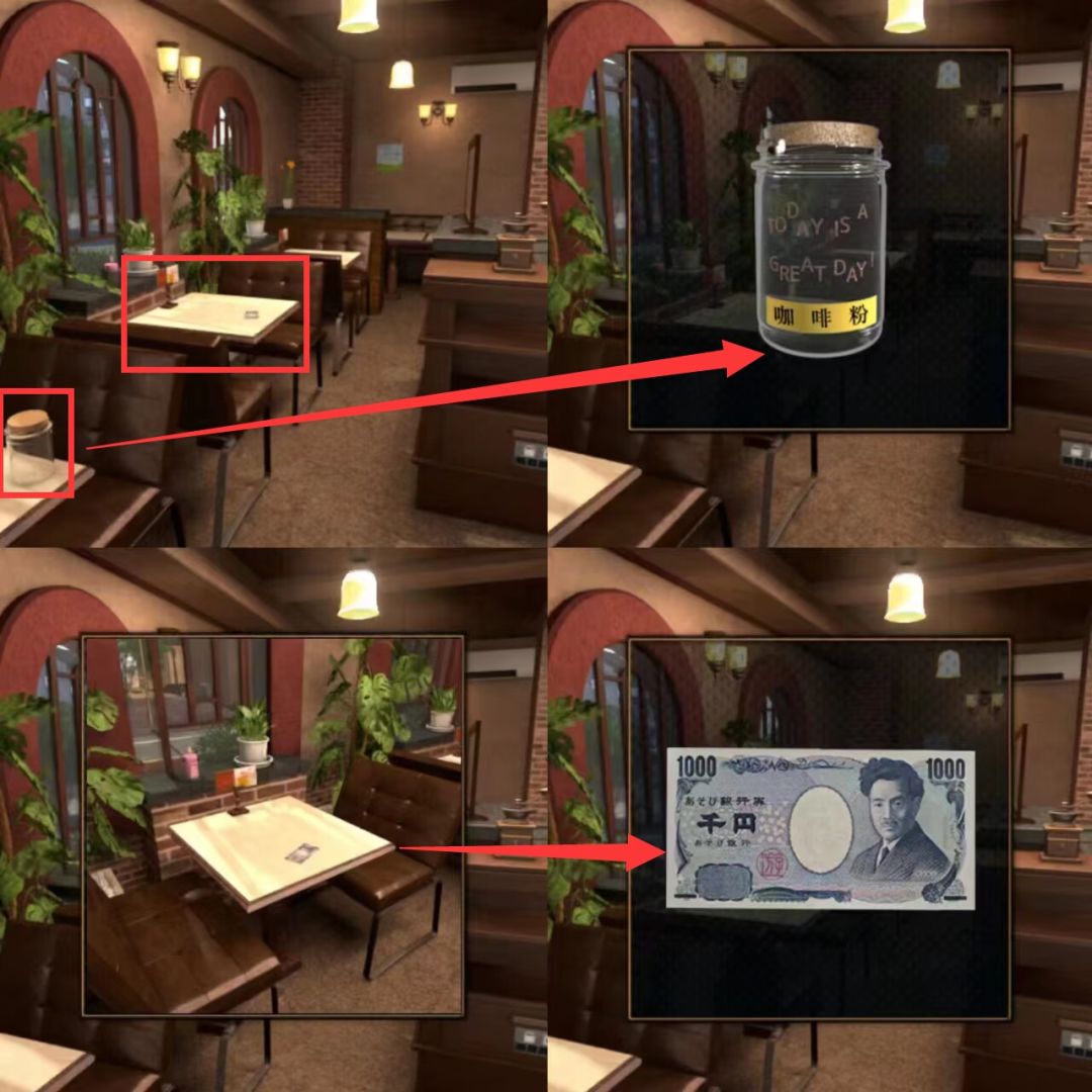 走进咖啡厅 拿走店内左手边桌上装咖啡粉的空瓶子 以及前面一张桌子上的钞票(钞票后面有用)