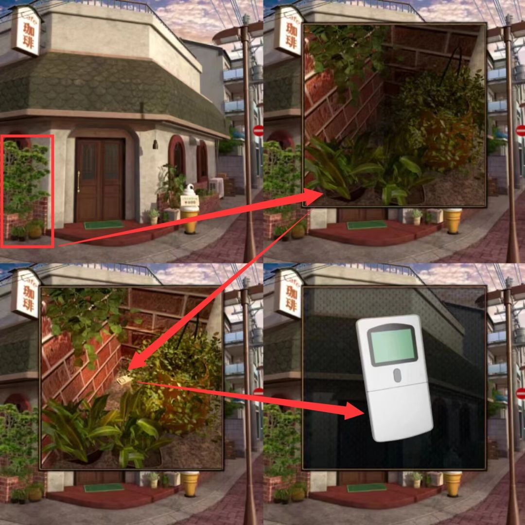 用手电筒照亮咖啡厅外面树丛一处乌黑看不清的地方 拿到空调遥控器