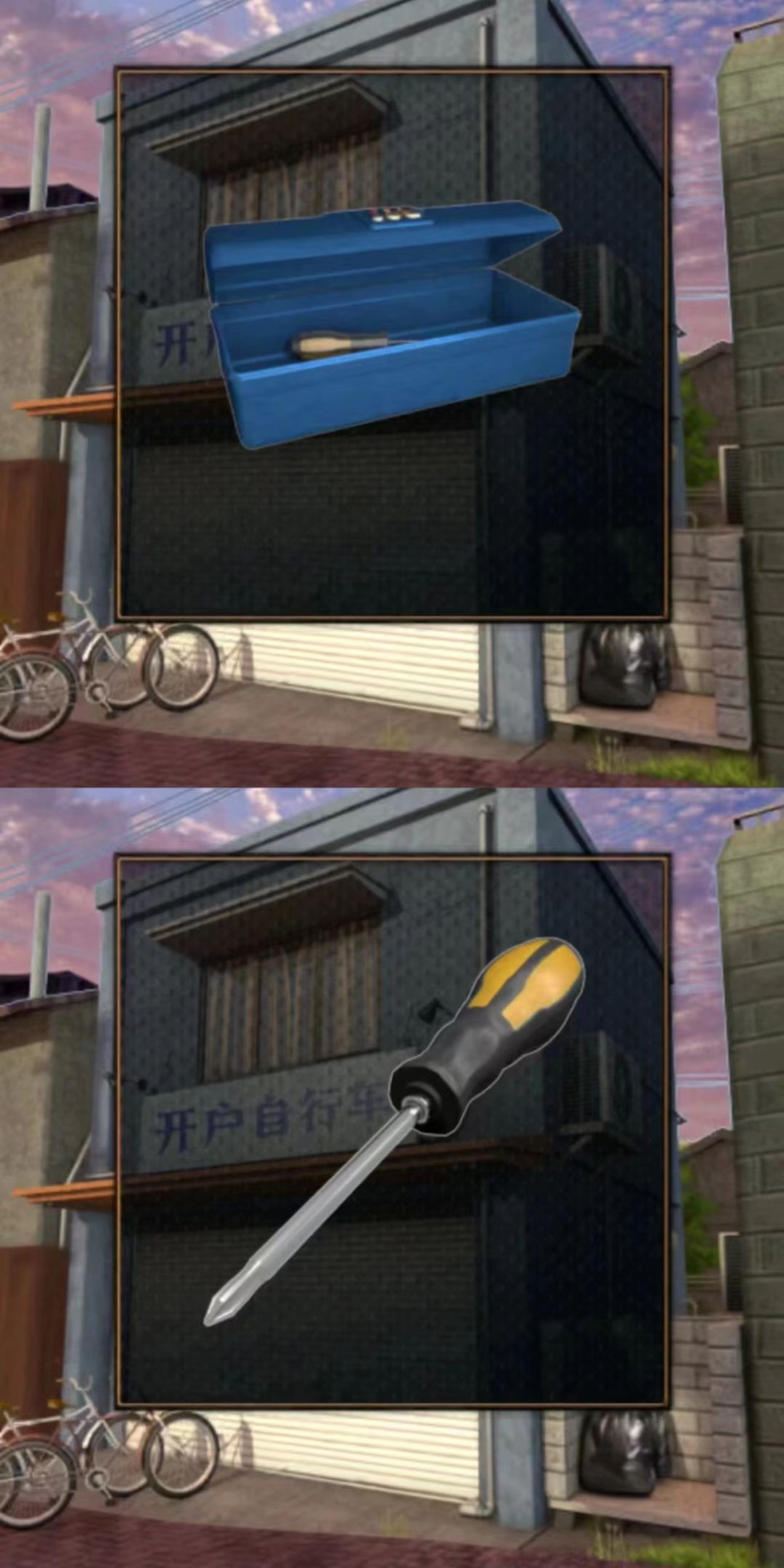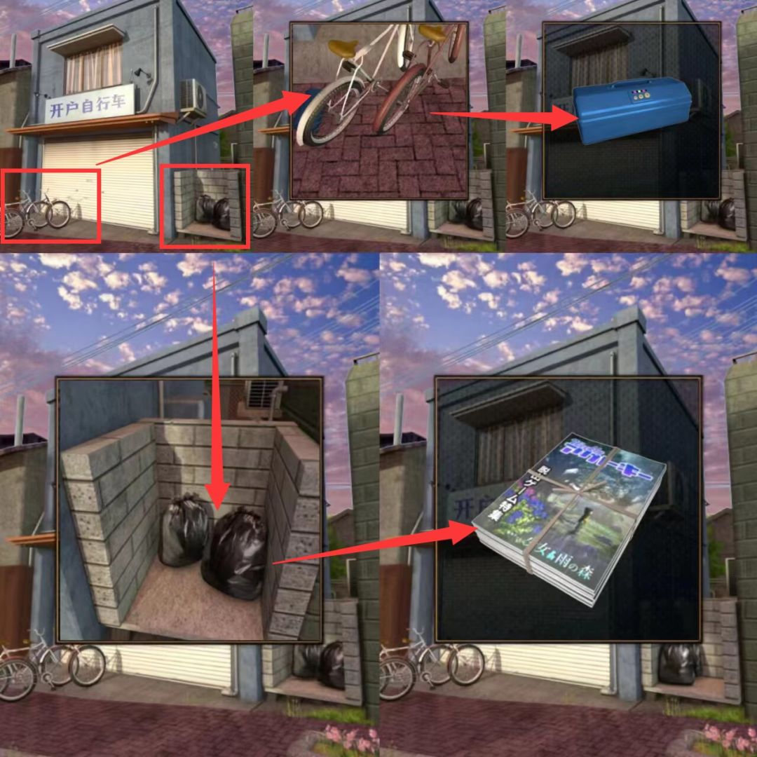 先挪开左侧两辆碍事的自动车 拿到工具箱 再去右侧的垃圾场挪开碍事的垃圾袋 拿到杂志