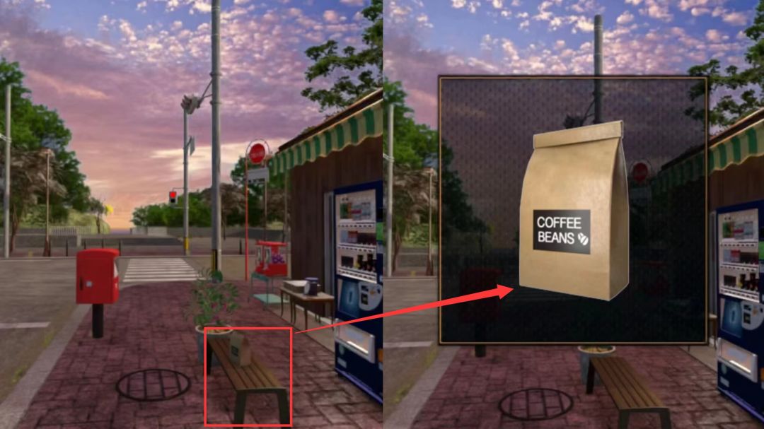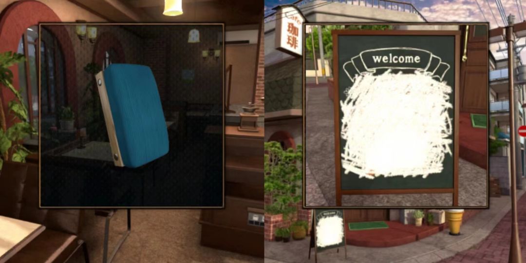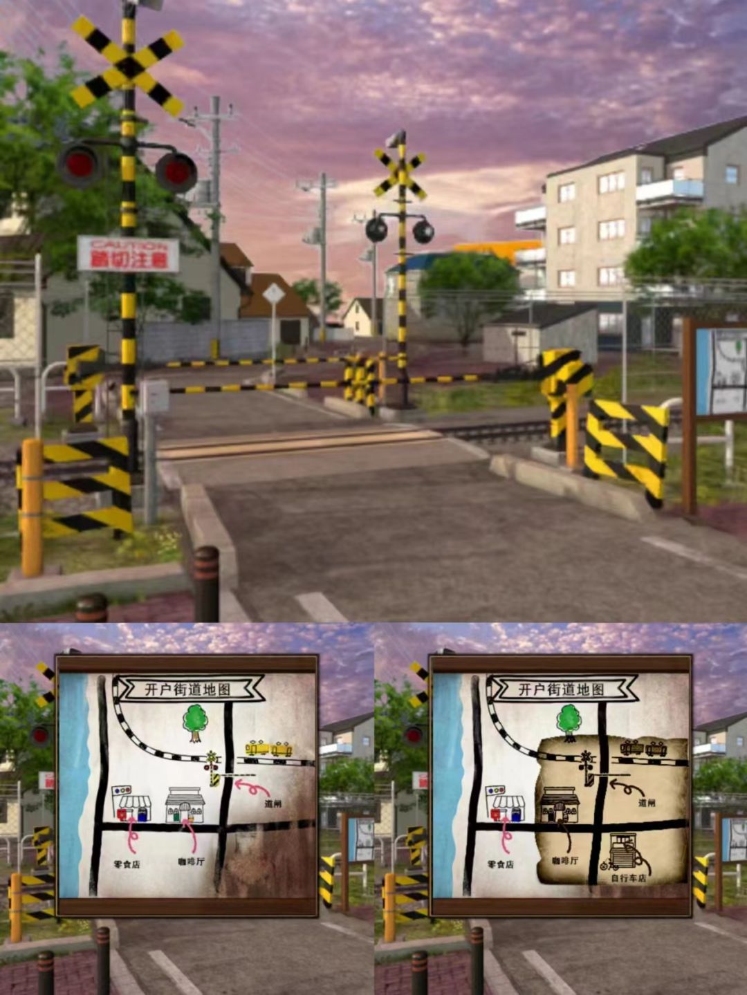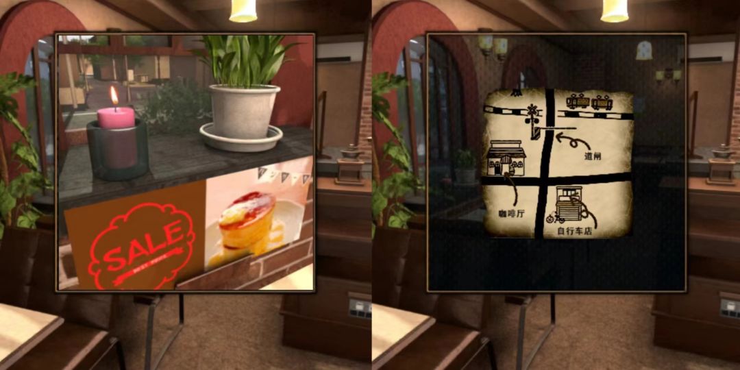 回到咖啡厅 把纸放在粉色蜡烛上 浮现出半张地图 →把半张地图拼在模糊开户街道地图上