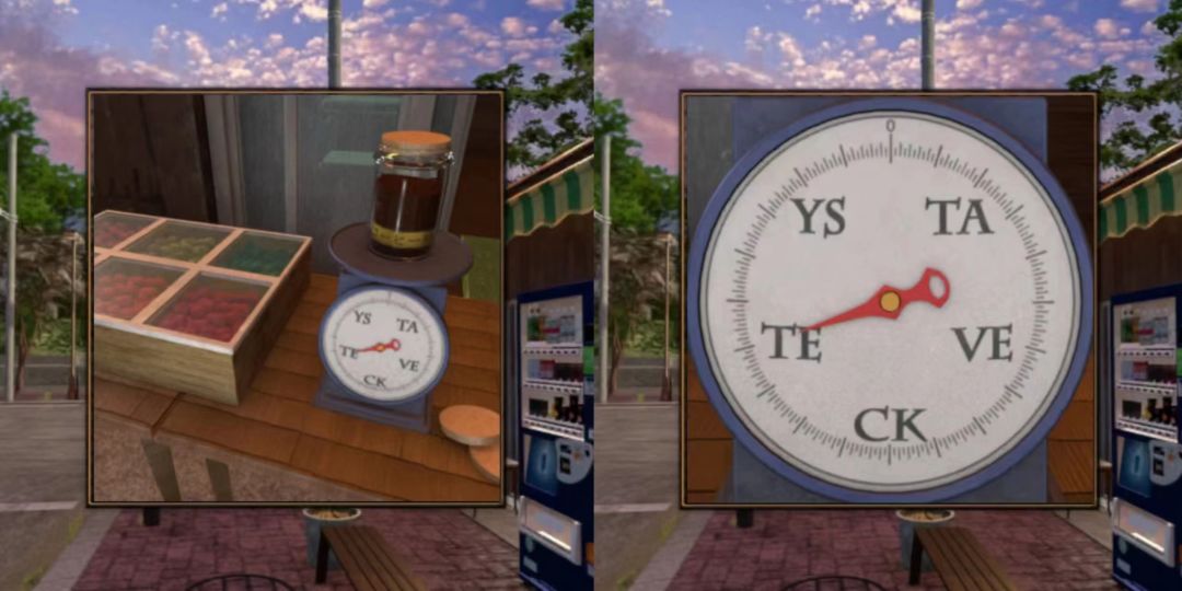 ↓←走到零食店前将装满咖啡粉的瓶子放在零食店门口的称上 指针指向“TE”位置