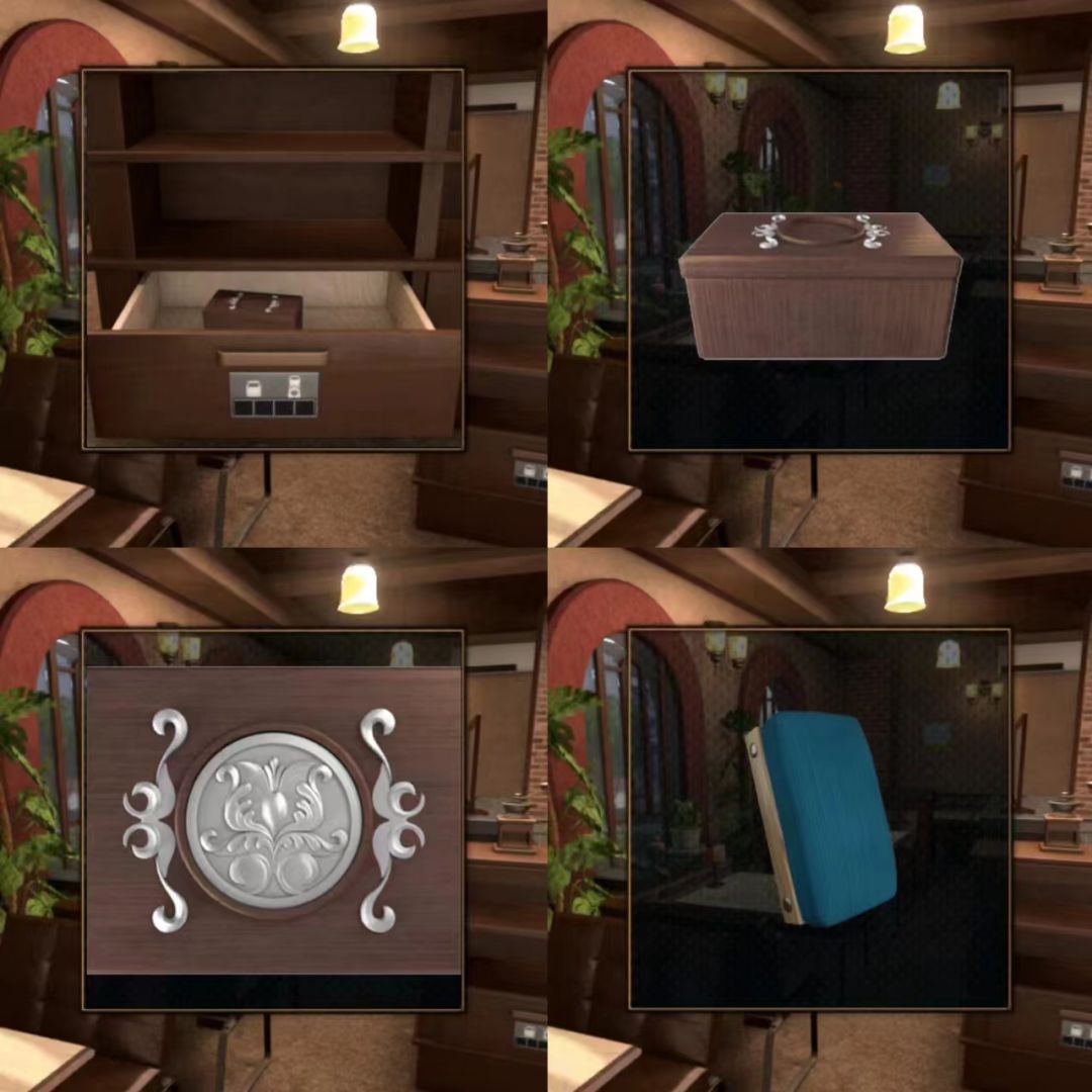 打开抽屉获得一个带锁的盒子 盒子上有个圆形凹槽 把从托盘上获得的银饰品放进去 锁打开 获得一个黑板擦