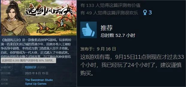 游戏名叫《逸剑风云决》,由一个叫“侠萌游戏”的独立团队开发。游戏发售初期一度因为字体、卡顿等问题显示“褒贬不一”,但之后的好评率每一天都在涨,如今已经超过90%。
