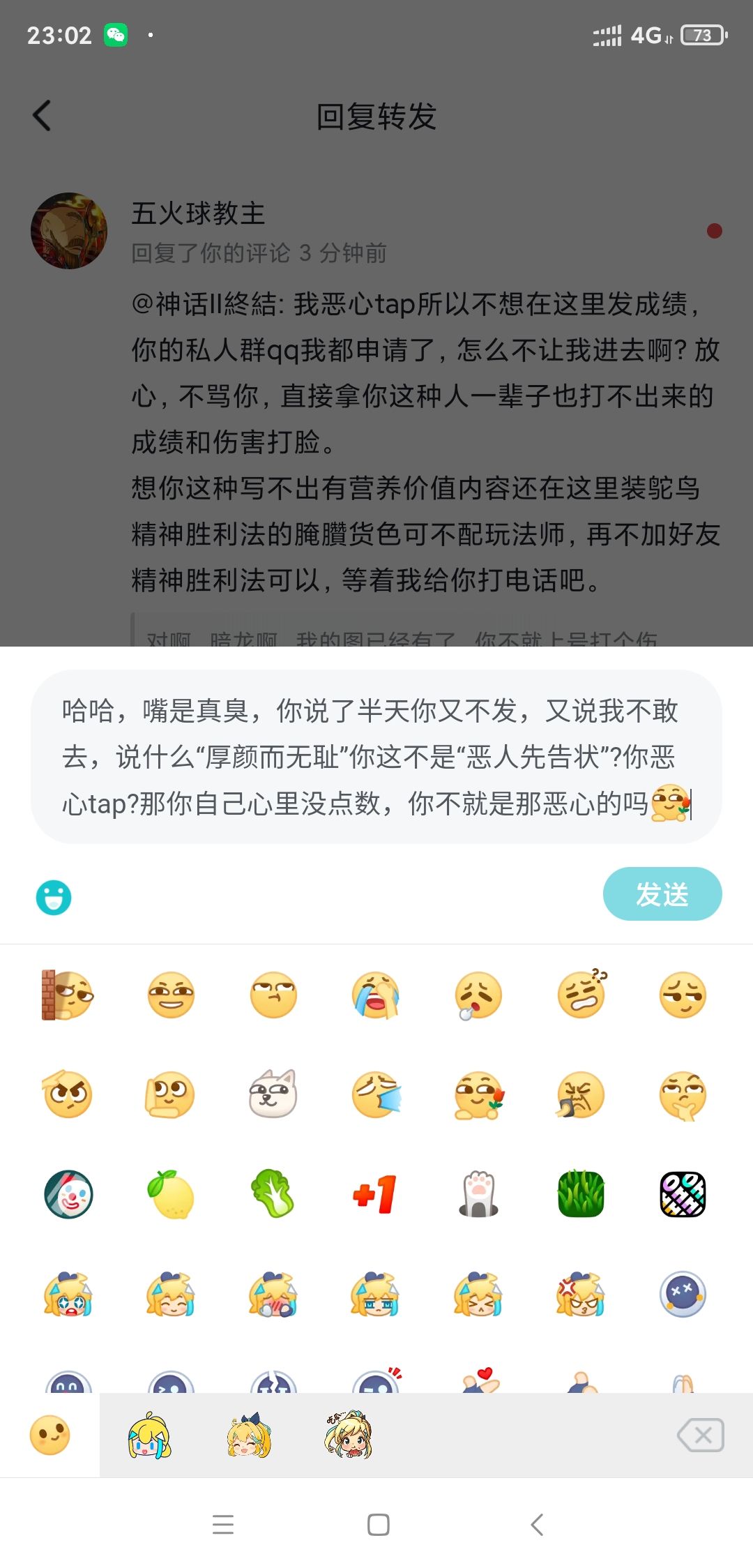 要说就光明正大的说,那不管你是哪路神仙,嘴臭就没资格谈,我好声好气聊,让我加个个人理解或萌新勿入之类的,本身我发的很多地方都表明了只是个人理解,我也加上了萌新勿触。然后更来劲语气暴起来,本来很多地方帮我指点出来让我收获颇丰,就开始嘴臭了,还想加我QQ躲着嘴臭,这我能加?精神胜利法?那是谁先拉黑的嘛。
