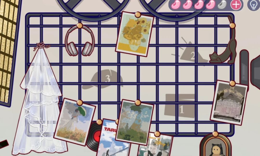 回到左边查看中间摄像机,将花束和柔光灯都放在剪影上,然后点击相册,按照铁丝板提示依次点击场记板-喇叭-帽子解锁相册,查看一下第一页重点主光左下角K,辅光右下角F,背光左上角B,记下来后继续向右翻,第二页还有个时间线索记下来1点20.