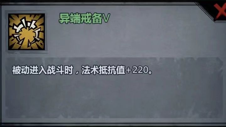 - 异端戒备5,圣堂技能,高额法术抵抗(面对满级角色,175抵抗值可转化出100%抵抗率,溢出抵抗率可以1:1转化为法术免伤),不必要