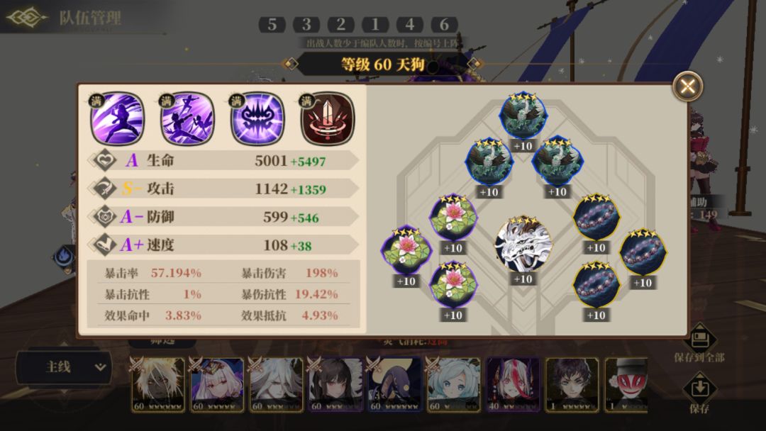 天狗2技能减灵气30,剩余灵气0,接秒掉群攻C,因为挂了减防100%伤害是可以打满的,目前我奇术只拉到2级,前四次攻击优先打选中的,即使秒不掉也残了