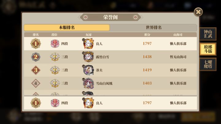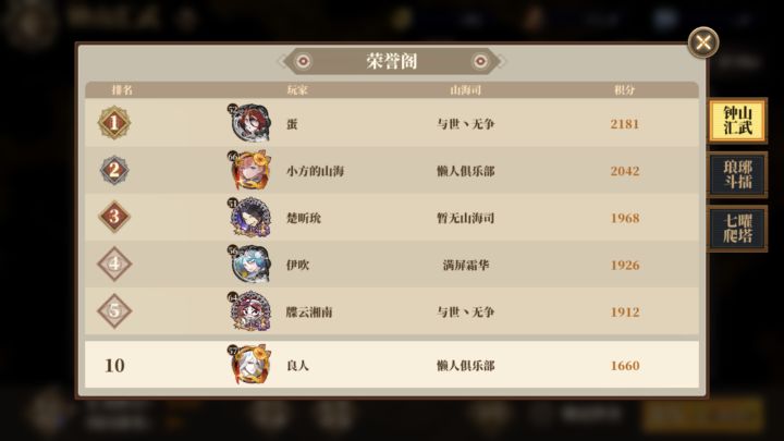 演武钟山会武打到过第一,因为之前积分算法更新了,获得积分一下子翻了几倍到十几倍不等,没有足够体力刷挑战券目前掉到十名,第一超过我500多分,早知道之前就留挑战券了50次至少也有800-1000分左右,琅琊斗擂目前本服排名第一,世界排名797,斗擂遇到过68级全员满蝶70级烛光队也被我碾压了,就是因为速度没有我快,所以最后再说一遍速度真的很重要