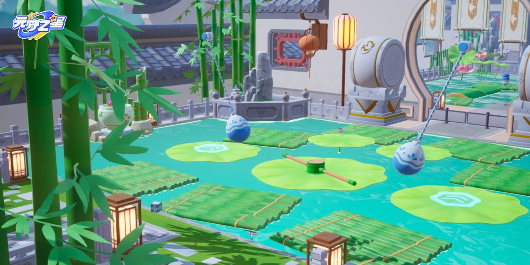 当然,如果你想要嗨起来,在这个无限大的超开星乐园里,来一次酣畅淋漓的闯关赛!不仅可以在丝滑水道里玩激流勇进;在神奇的巨石迷阵里上演夺宝奇兵;甚至可以在落英缤纷,小桥流水的古风庭院地图里,一边感受竹筏静伫、荷叶微动,一边进行刺激闯关,感受中国人派对游戏独有的浪漫。
