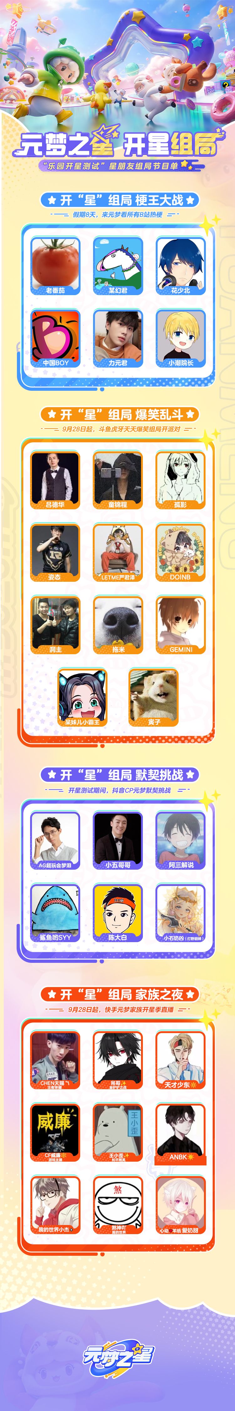 同时,来自多个视频平台的达人也将集结元梦开星季,他们会在【乐园开星测试】期间,变身可爱星宝,入园试玩。获得测试资格的玩家们可以把握机会,与他们成为好友,一起畅游乐园!