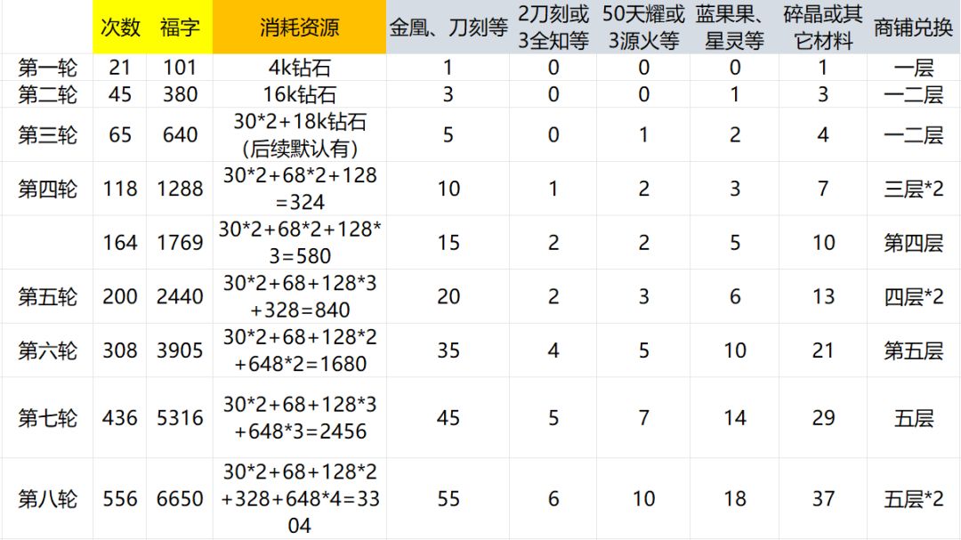 花灯整体消耗没啥变化,基本稳定下来了,细节内容可以看之前的五一花灯解析。然后主要兑换的物品最新版本有一定变化。好运,基本上缺啥换啥。旺运推荐铭文,毕竟现在来说铭文的途径非常少,洗练好一个铭文装备还是有必要的,属于慢慢积累的过程。吉运这里推荐500奥义之眼,其它缺口没那么大。顺便吐槽下,吉运这里只给500有点少了。鸿运依旧传统两个刀刻。最后的天福,到了天福的小伙伴一般很少缺金凰了。最近版本星瀚幻兽高星青鸟表现非常亮眼,考虑天福的小伙伴,可以目标5星青鸟走起。后续商铺也可以考虑先兑换青鸟。