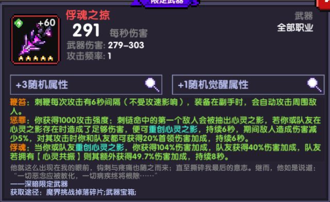佩戴建议:单人配合另一把深暗武器佩戴,组队只用辅助佩戴,主C不需要携带。