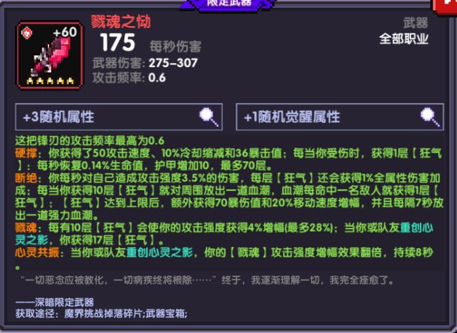【硬撑】50攻速,10%冷缩,36暴击值,还有生命恢复。对于一些需要满攻速满冷缩的BD挺友好的。受伤叠【狂气】