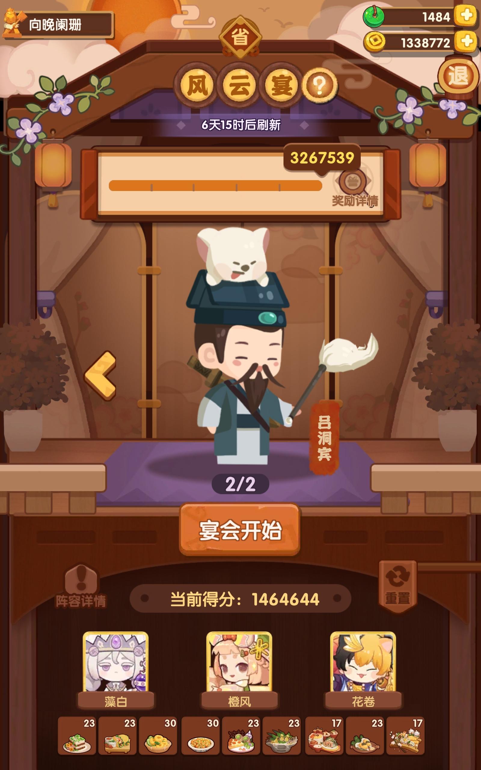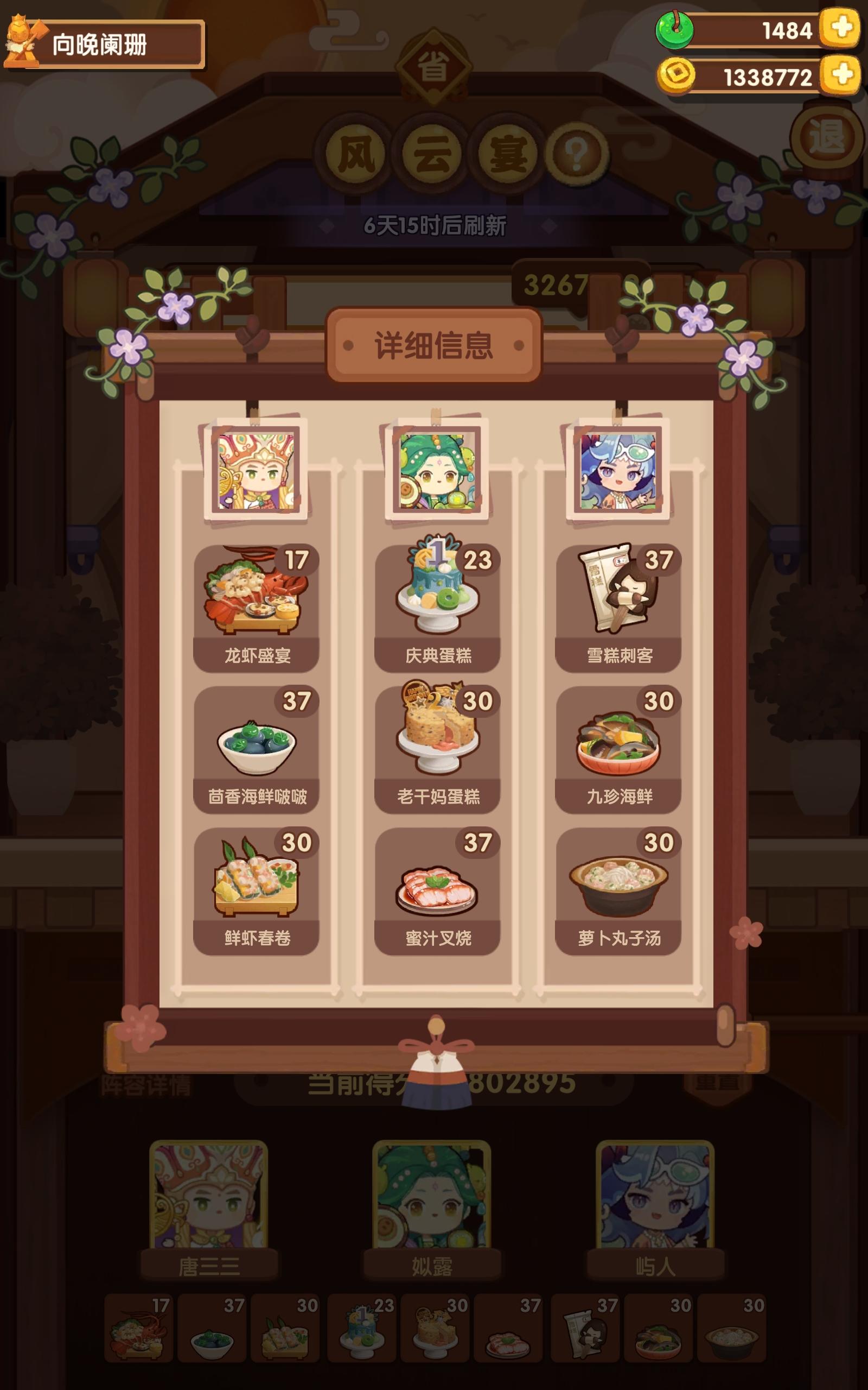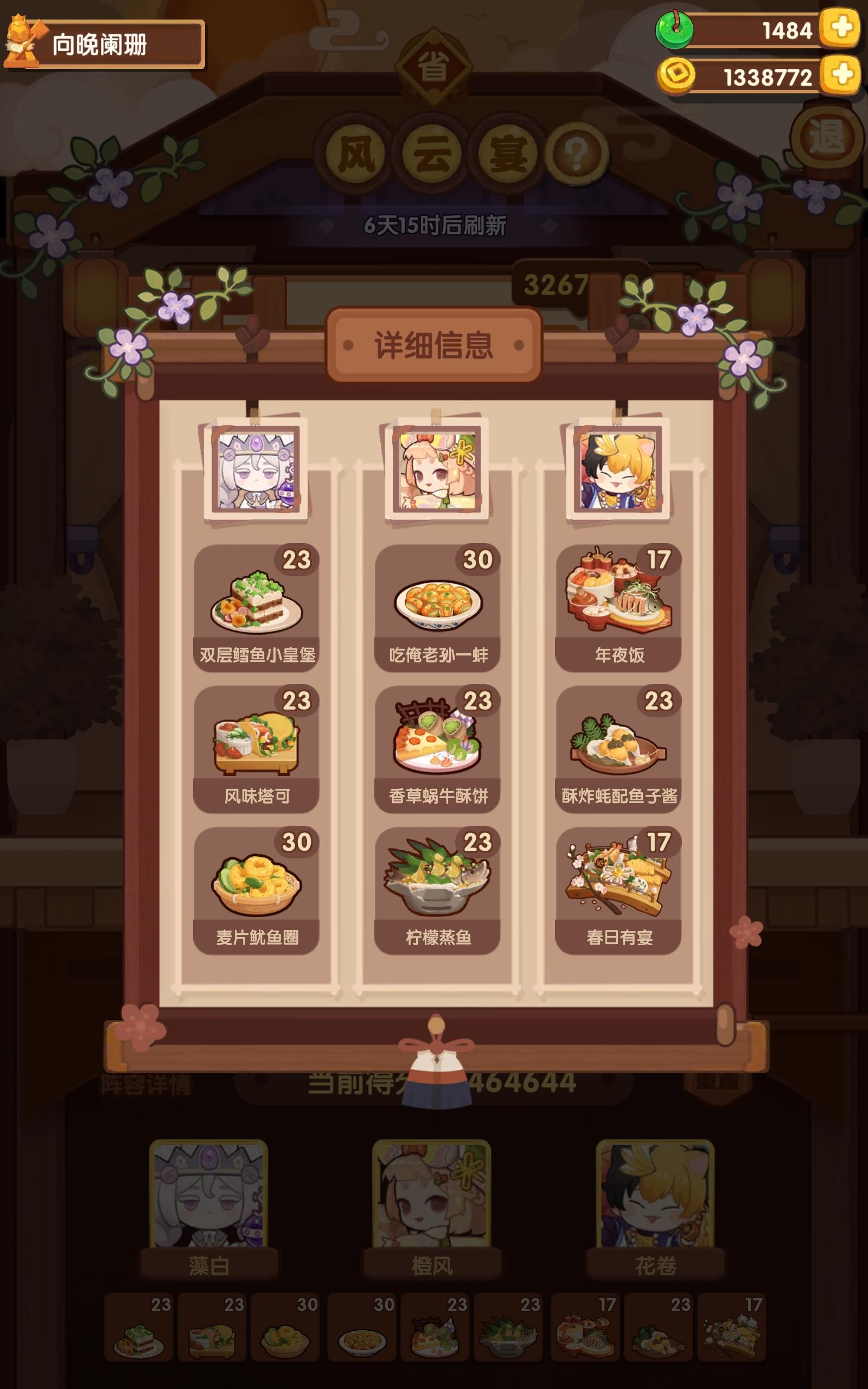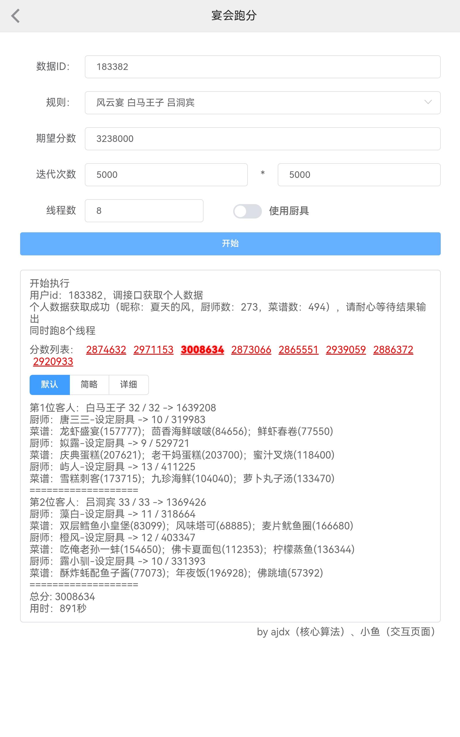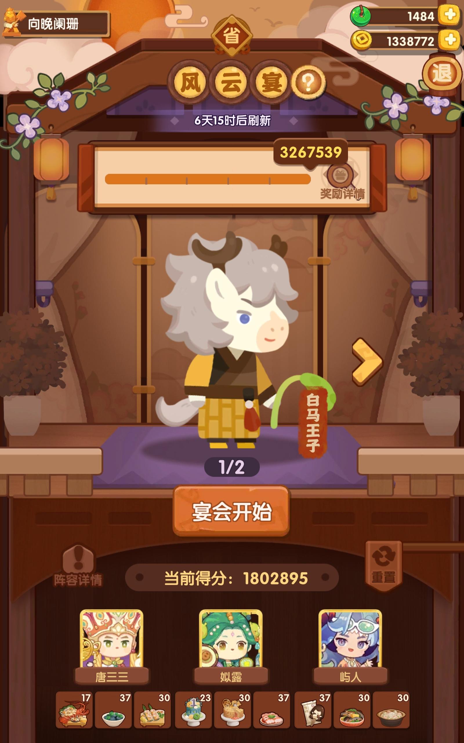 刚好卡线,除了藻白和橙风,其他都带了加价厨具。跑分最后跑出来的饱值不对,调整了橙风的第二道菜和最后一个厨师,提醒一下,最后一个不论是用花卷还是露小驯,年夜饭都必须放第一道。