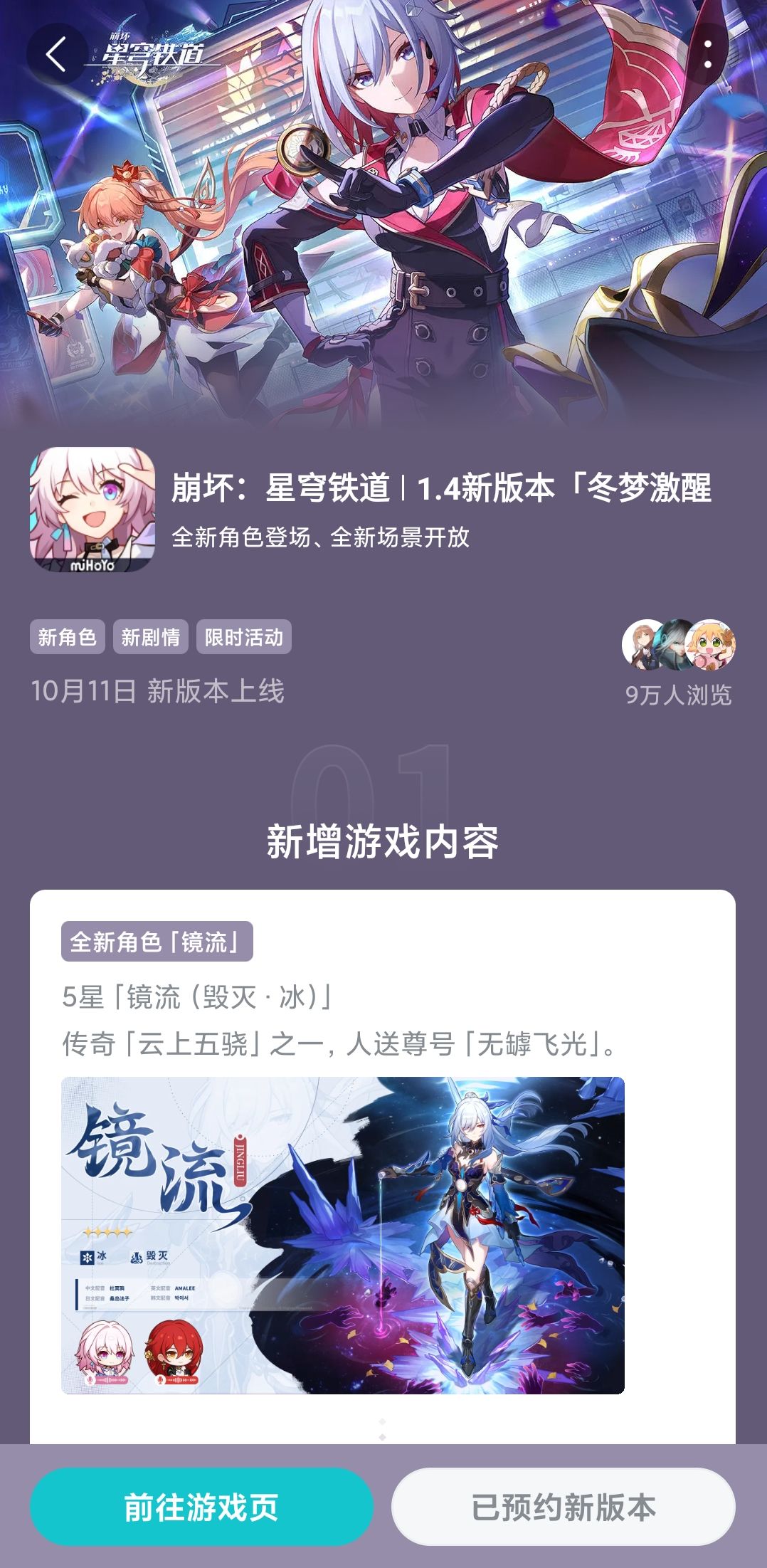 《崩坏:星穹铁道》1.4版本「冬梦激醒」将于2023年10月11日上线,完成新版本预约的开拓者即可在第一时间获取版本更新通知。